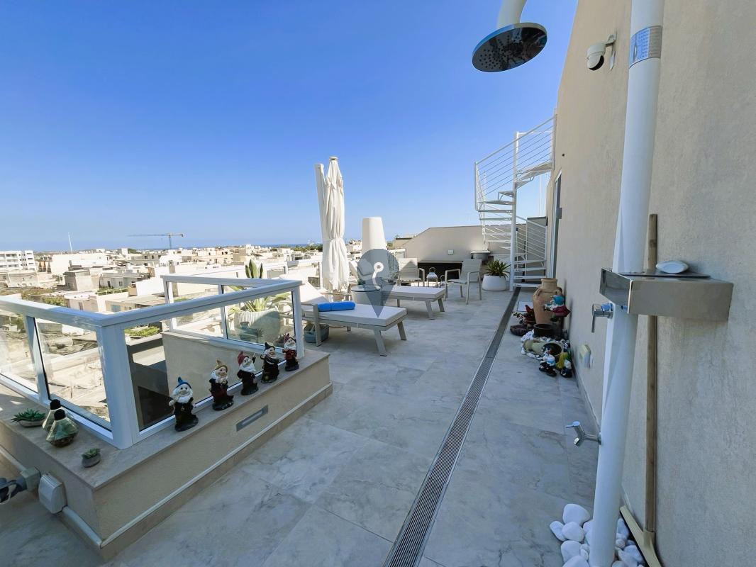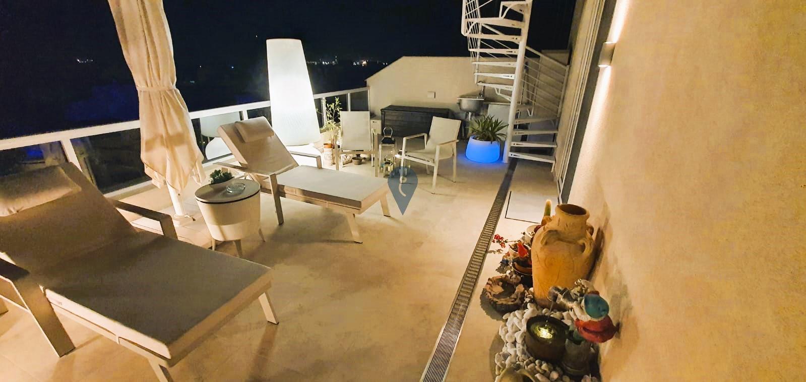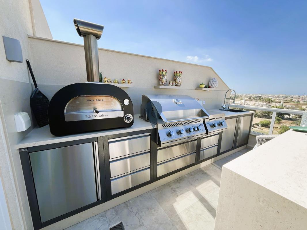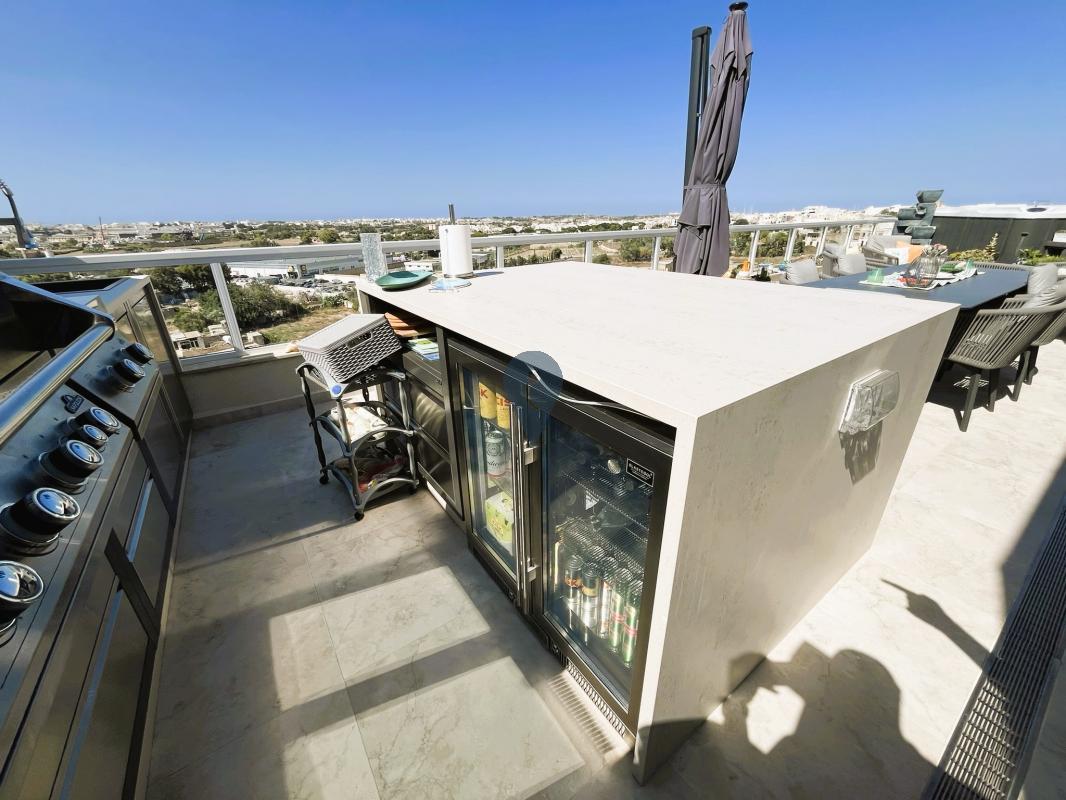 The expansive outdoor terrace is an entertainer’s dream, featuring a fully equipped outdoor kitchen by Napoleon complete with a fridge, pizza oven, BBQ, and grill setup, alongside an outdoor sofa and a luxurious Dolphin model Jacuzzi. Sustainability is also a key feature, with a 14-panel photovoltaic system generating approximately 51 units daily.