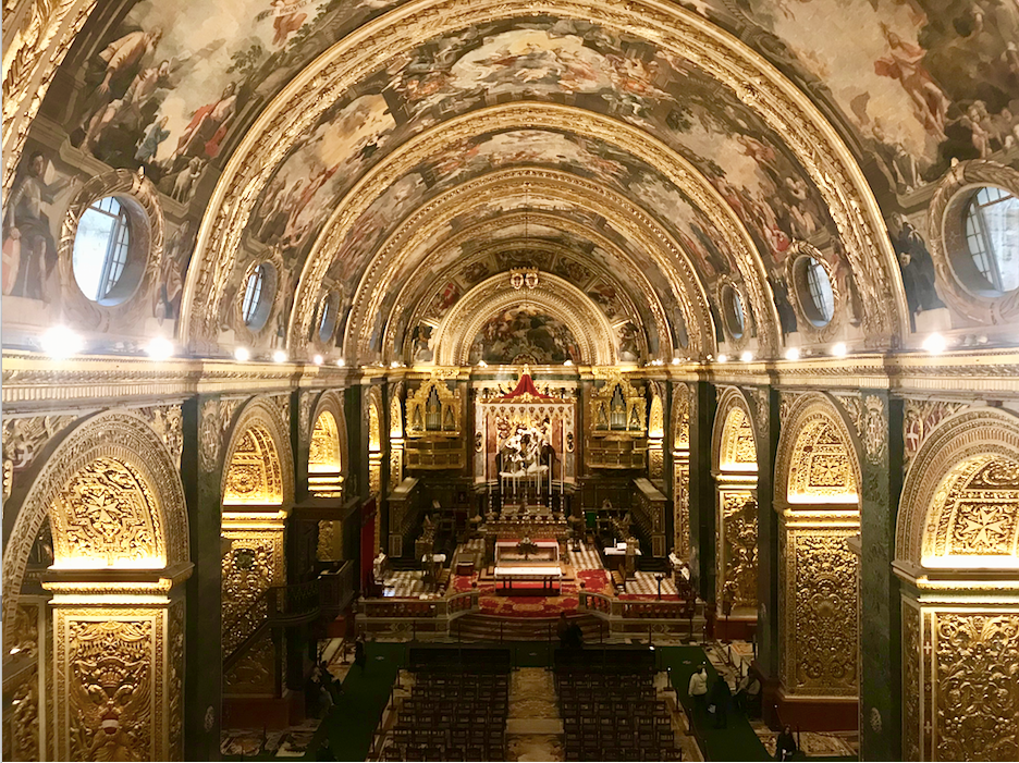 The floor consisting of marbled slabs decorated with coat of arms, the co-cathedral houses the tombs of the Knights of the Order. The vault, meanwhile, is entirely covered with frescoes depicting the life of St. John the Baptist. Every pillar and walls are covered in gold!