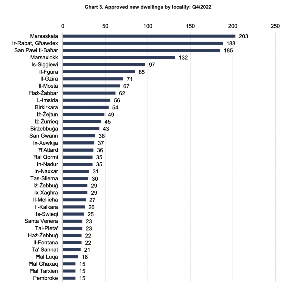 Finally, the highest number of approved new dwellings (203) was registered in Marsaskala, indicating a high level of construction activity in this area.
