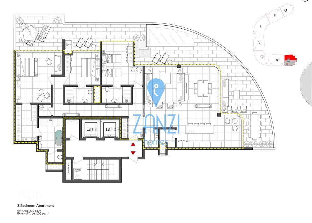 This fifth floor APARTMENT's 210 square metre internal floor area features a kitchen, living and dining area leading out onto a stunning 105 square metre wrap-around front terrace enjoying magnificent seaviews, three bedrooms (all with en-suite and master with walk-in-closet, a laundry/utility room and the main bathroom.