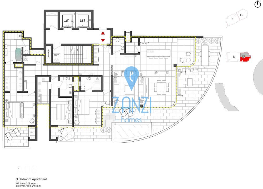 This eight floor APARTMENT's 208 square metre internal floor area features a kitchen, living and dining area leading out onto a stunning 90 square metre wrap-around front terrace enjoying magnificent seaviews, three bedrooms (all with en-suite and master with walk-in-closet, a laundry/utility room and the main bathroom.