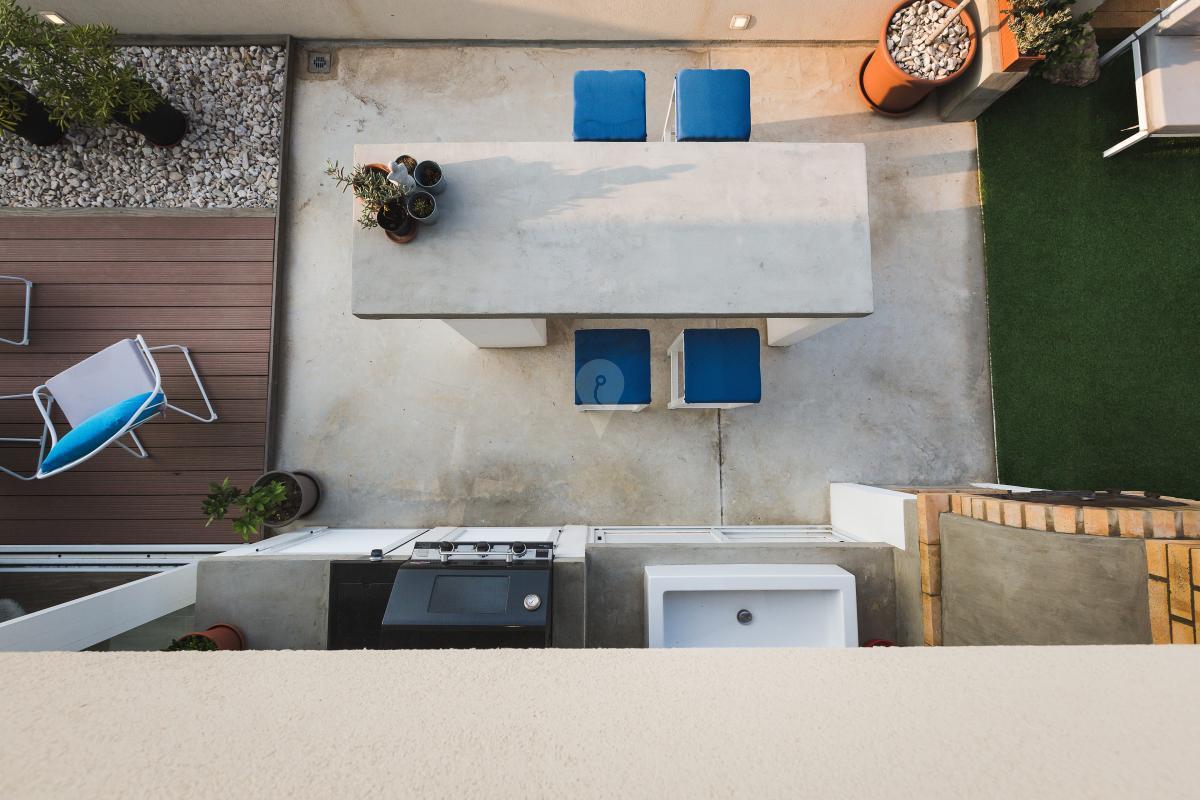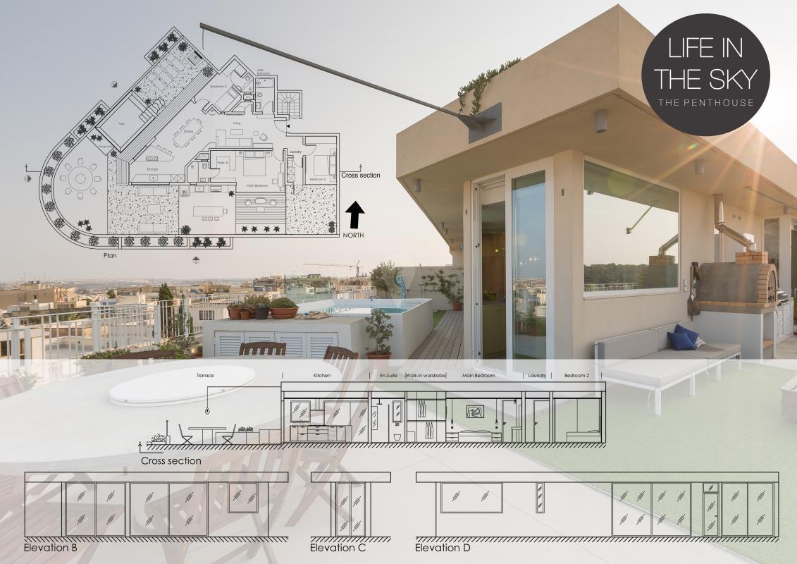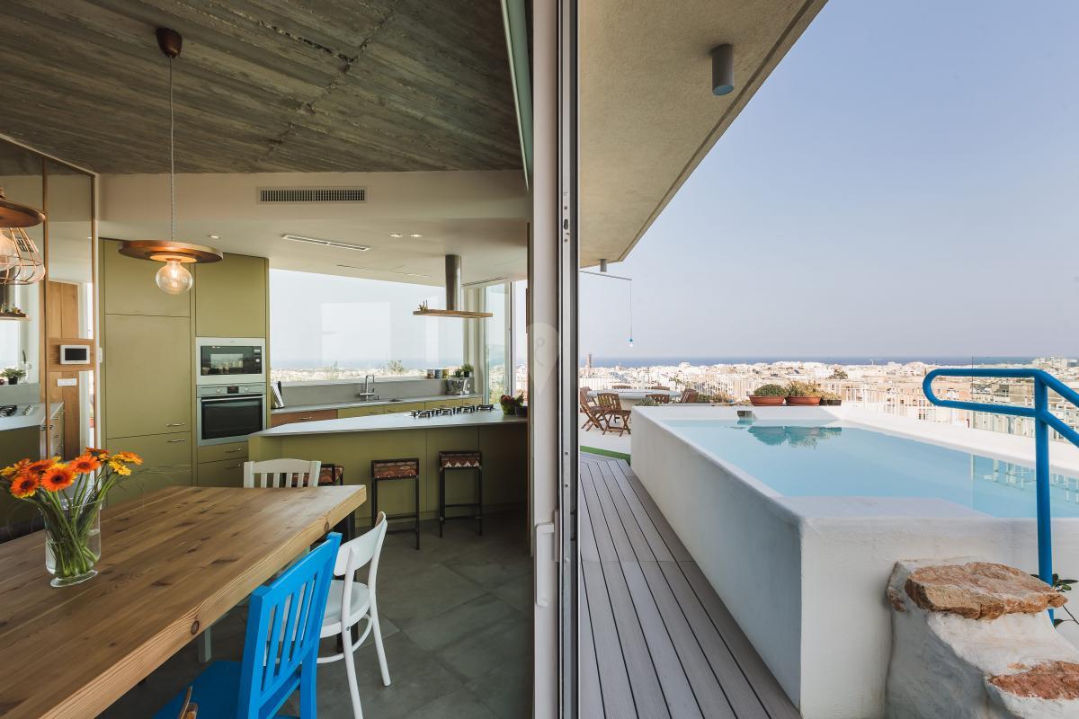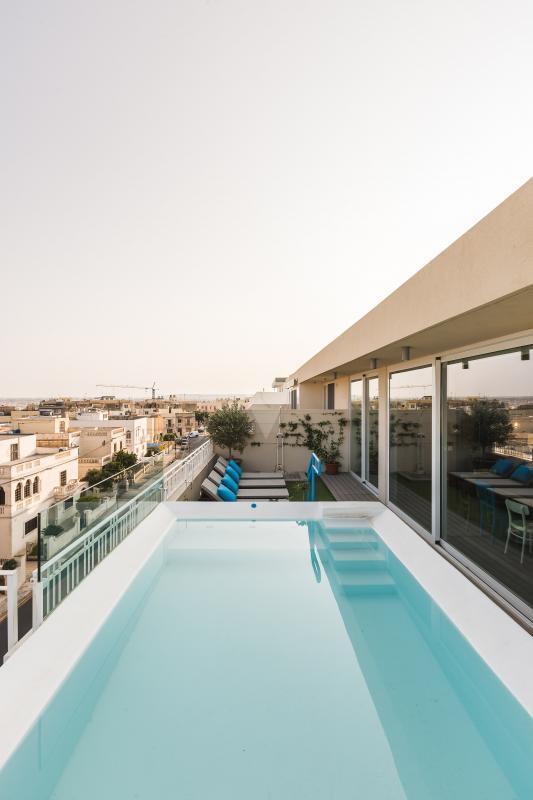 SAN GWANN - A state of the art designer furnished penthouse situated in a very sought after area of town and within walking distance to all amenities. Property comprising of an entrance hall, open plan Kitchen / Living / Dining Room, three Double Bedrooms (two with an en-suite), walk-in wardrobe, Laundry room, Utility room, main Bathroom and surrounding terrace. This penthouse enjoys 270 degrees views of Malta with lots of natural light. All rooms lead directly onto the terrace which of course is the perfect way of entertaining with an outdoor kitchen, a pizza oven, chill out area and pool with a jacuzzi enjoying unobstructed views. Complimenting this property is a three car interconnecting garage.