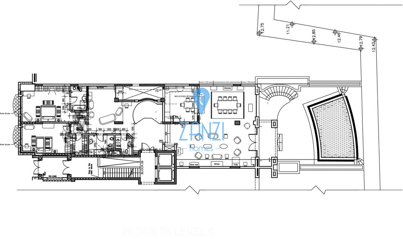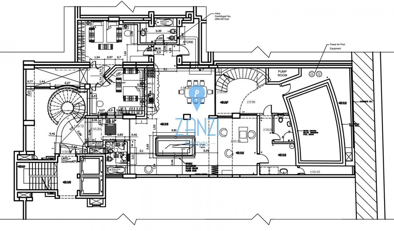 The internal layout at the lower level comprises a kitchen, living, and dining area, two bedrooms, two bathrooms, a large games room, a study, a laundry room, a utility room, a shower room, and stairs leading to the private swimming pool terrace.