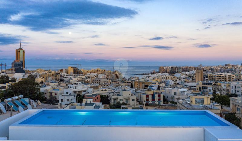 SWIEQI - A bright and spacious Duplex SKY VILLA set on the sixth and seventh levels of a smart new block comprising nine units and located on one of the best residential streets in Swieqi. Layout in the form of a massive open plan kitchen, living and dining area leading out onto a front terrace, four bedrooms (master with en-suite), the main bathroom, utility room, games room and a terrace at the rear of the property. An 12 metre by 4 metre private swimming pool and deck area commanding panoramic, distant seaviews occupies the upper level of this one-off, stunning residence. Offered in a highly finished and furnished state. Interconnecting garages available . Viewing is recommended!