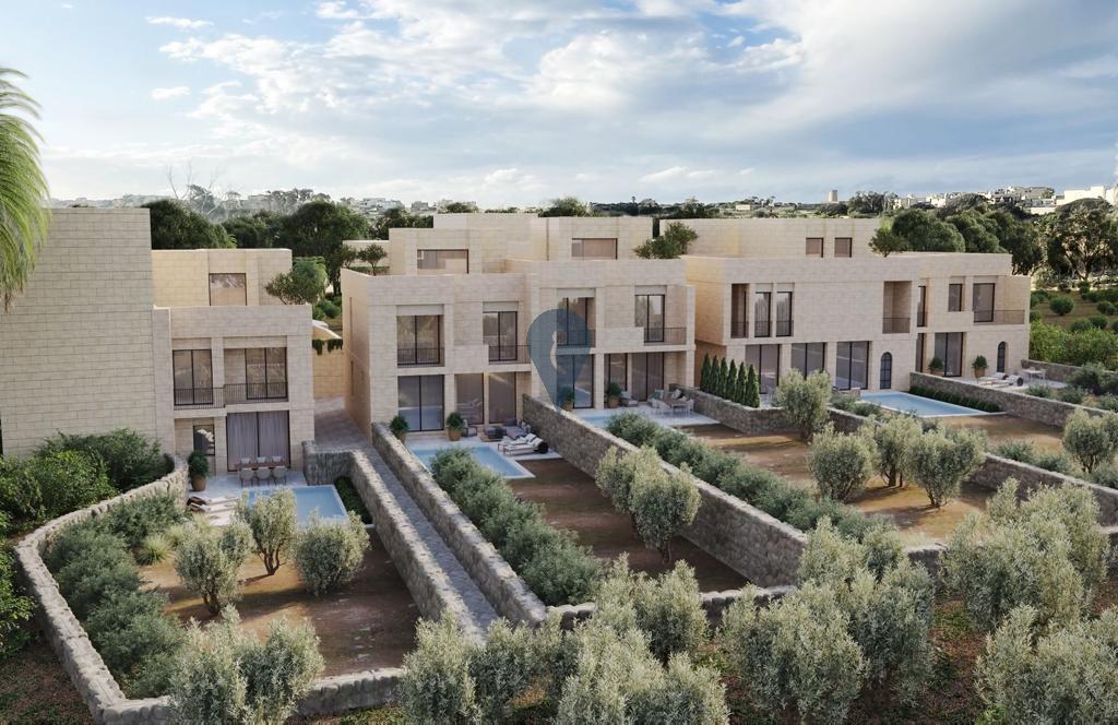 QALA, Gozo - Situated in a serene and picturesque corner of the village, this residence is part of an enclave featuring five newly constructed terraced houses. The house offers a well-designed layout, including an open-plan kitchen/dining/living area, a guest bathroom, a private swimming pool, a deck area, and a garden on the ground floor. The first floor comprises three bedrooms, each with an en-suite and a balcony, while the second floor boasts a fourth bedroom with a spacious terrace. Additionally, the property features a street-level garage and a large cellar. Offered in shell form with completed common areas and driveways, this residence is available as a freehold property.