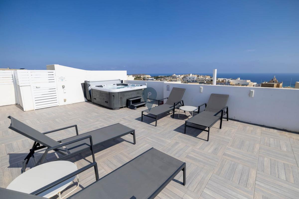 XAGHRA Gozo - Discover the charm of Xagħra, Gozo, from this beautifully designed south facing terraced penthouse, offering views and a private jacuzzi. With two bedrooms and two bathrooms, the property can be an ideal choice for both a relaxing getaway and a base in Gozo.