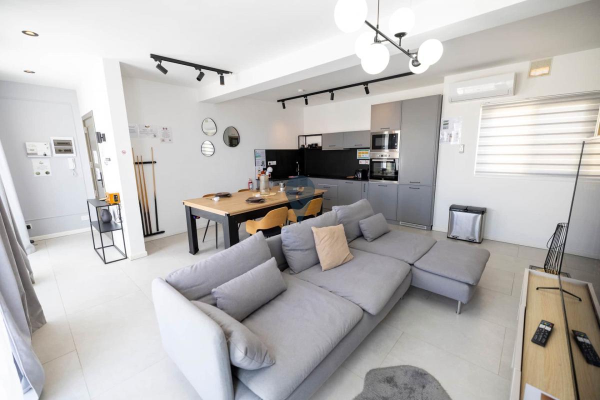 The living area flows seamlessly into a fully equipped kitchen and dining space, creating a bright and inviting atmosphere. Large windows and a private terrace bring in natural light while offering stunning vistas, perfect for enjoying a morning coffee or an evening bbq.