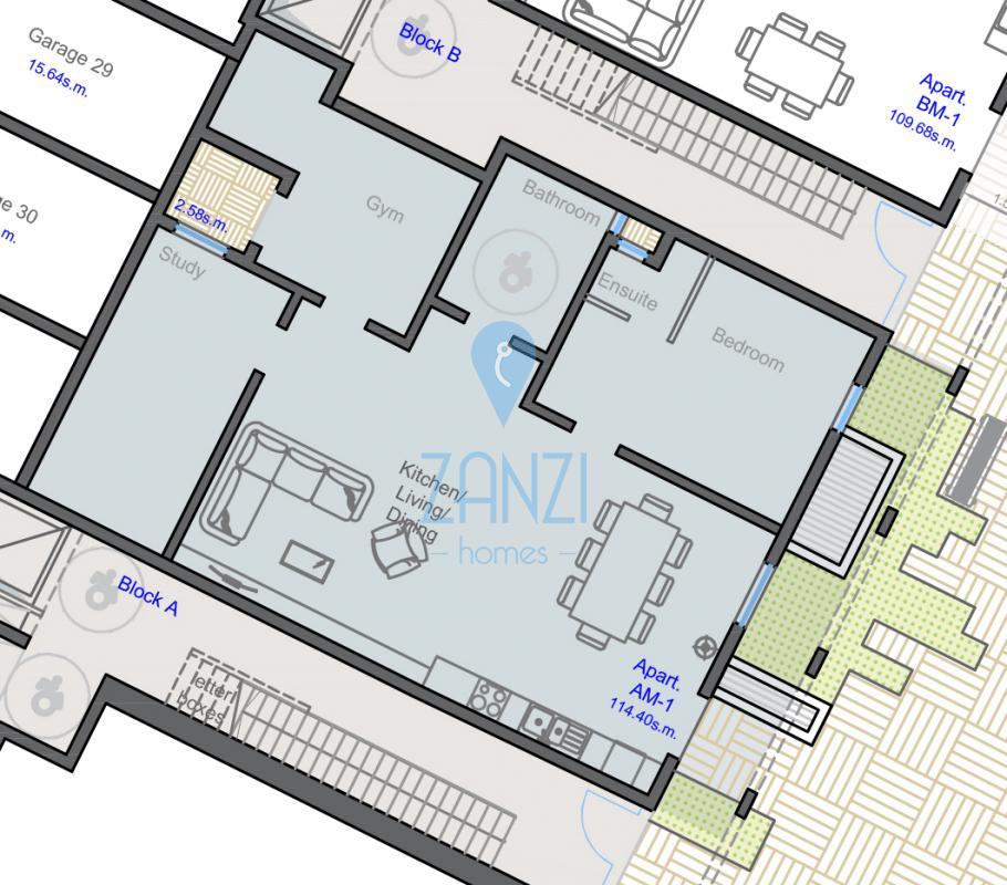 Ground floor maisonette comprising an open plan kitchen / dining / living room, main bedroom, two bathrooms, two study rooms (can be used as additional bedrooms) and an internal yard. Being offered in semi-finished state (including external apertures, front door, tiling of yard and water tank and other finishings) with finished common parts, swimming pool and gardens. Freehold. Optional garages at ground and basement levels. Finishing packages on request.