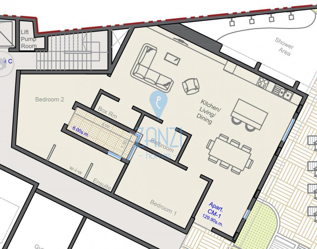 Ground floor maisonette comprising an open plan kitchen / dining / living room, two bedrooms, two bathrooms and a box room. Being offered in semi-finished state (including external apertures, front door, tiling of yard and water tank and other finishings) with finished common parts, swimming pool and gardens. Freehold. Optional garages at ground and basement levels. Finishing packages on request.