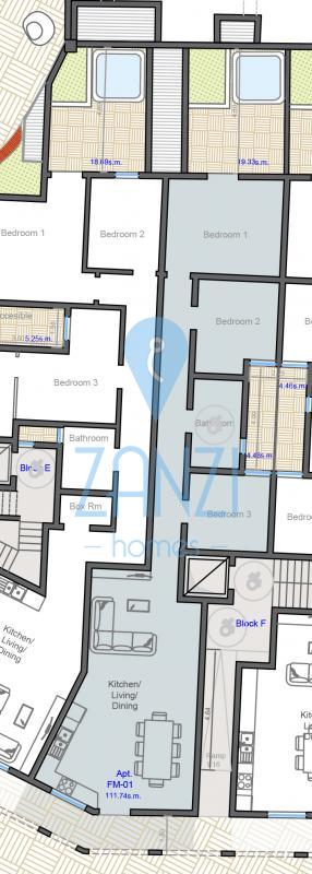 Ground floor maisonette comprising an open plan kitchen / dining / living room, three bedrooms, main bathroom and a back yard with ample space for a jacuzzi. Being offered in semi-finished state (including external apertures, front door, tiling of yard and water tank and other finishings) with finished common parts, swimming pool and gardens included in the price. Freehold. Optional garages at ground and basement levels. Finishing packages on request.
