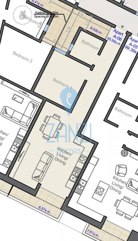 First floor apartment comprising an open plan kitchen / dining / living room, main bedroom, bathroom, a yard and a front terrace. Being offered in semi-finished state (including external apertures, front door, tiling of yard and water tank and other finishings) with finished common parts, lift, swimming pool and gardens included in the price. Freehold. Optional garages at ground and basement levels. Finishing packages on request.