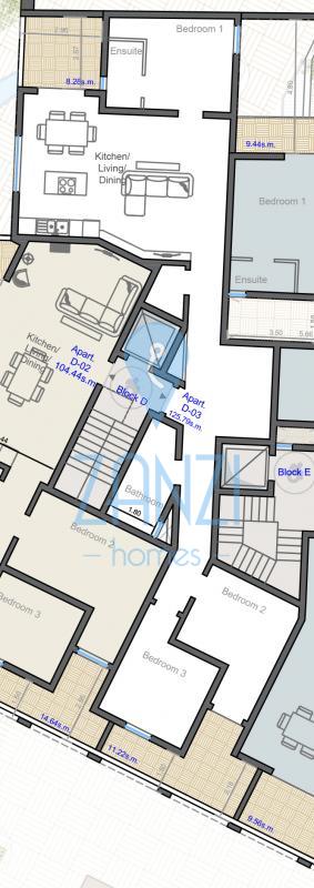 First floor apartment comprising an open plan kitchen / dining / living room, three bedrooms, two bathrooms and two terraces. Being offered in semi-finished state (including external apertures, front door, tiling of yard and water tank and other finishings) with finished common parts, lift, swimming pool and gardens included in the price. Freehold. Optional garages at ground and basement levels. Finishing packages on request.