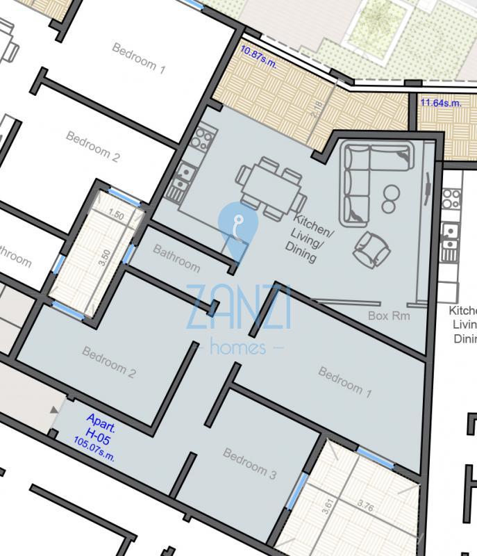First floor apartment comprising an open plan kitchen / dining / living room, three bedrooms, main bathroom and a front terrace. Being offered in semi-finished state (including external apertures, front door, tiling of yard and water tank and other finishings) with finished common parts, lift, swimming pool and gardens included in the price. Freehold. Optional garages at ground and basement levels. Finishing packages on request.