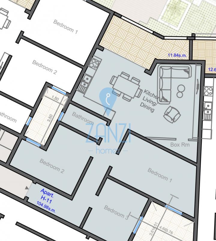 Third floor wide-fronted apartment comprising an open plan kitchen / dining / living room, three bedrooms, main bathroom, and a front terrace. Being offered in semi-finished state (including external apertures, front door, tiling of yard and water tank and other finishings) with finished common parts, lift, swimming pool and gardens included in the price. Freehold. Optional garages at ground and basement levels. Finishing packages on request.