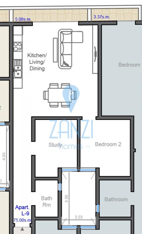 Second floor apartment comprising an open plan kitchen / dining / living room, main bedroom, study, bathroom and a front terrace. Being offered in semi-finished state (including external apertures, front door, tiling of yard and water tank and other finishings) with finished common parts, lift, communal swimming pool and gardens included in the price. Freehold. Optional garages at ground and basement levels. Finishing packages on request.