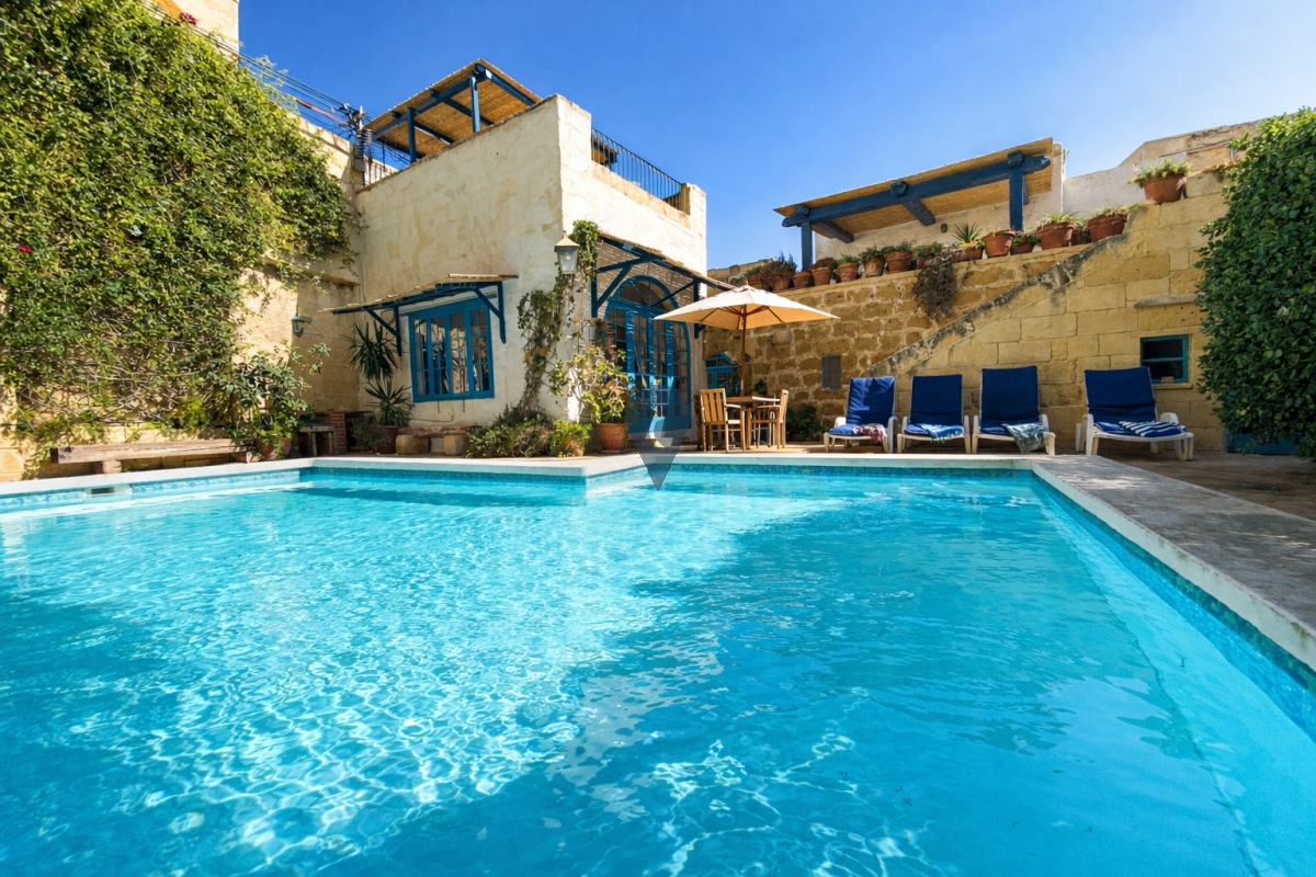 Situated on the outskirts of Żebbuġ, this traditional farmhouse is the perfect choice for a charming holiday home or a full-time residence. Set on a generous footprint of over 400 square meters, it boasts a spacious pool and extensive deck space.