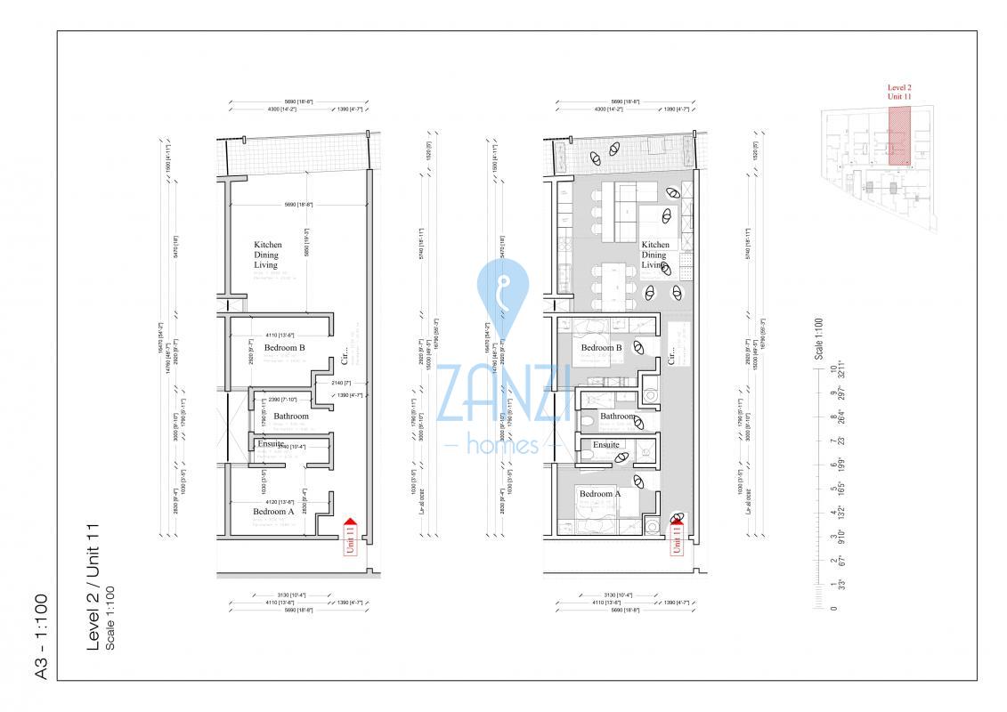 It features two levels of car parking spaces at levels "minus three" and "minus two", a supermarket at level "minus one", a commercial space at level "zero", two and three-bedroom apartments at levels "one" and "two", and penthouses at level three. Level "zero" will also feature a 3300 sqm plant nursery, complete with trees and plants, next to the project.