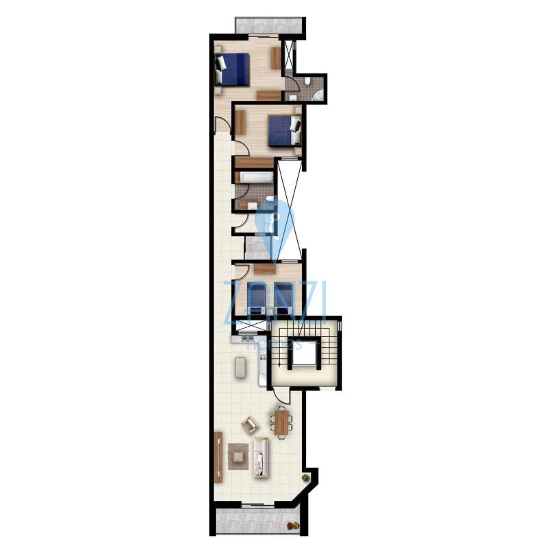Fourth-floor, three-bedroom, two-bathroom apartment with spacious open-plan kitchen/dining/living room, front terrace, and back balcony enjoying the view. Being offered fully finished and served with lift. Freehold.
