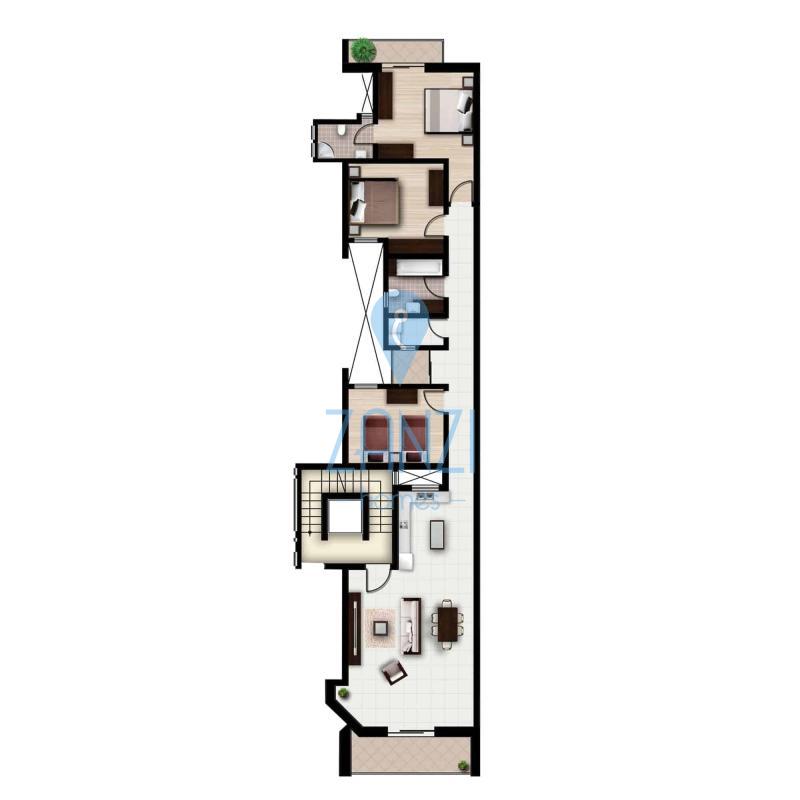 Fourth-floor, three-bedroom, two-bathroom apartment with spacious open-plan kitchen/dining/living room, front terrace, and back balcony enjoying the view. Being offered fully finished and served with lift. Freehold.