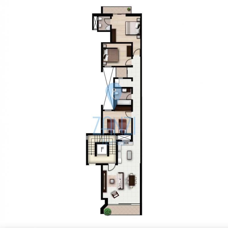 Fourth-floor, three-bedroom, two-bathroom apartment with spacious open-plan kitchen/dining/living room, front terrace, and back balcony enjoying the view. Being offered fully finished and served with lift. Freehold.