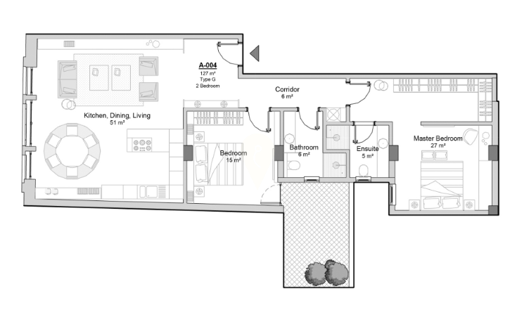 The main entrance of the building has been designed based on a similar alignment and proportion of the old entrance into the building. Its size and proportions give it a sense of subtle grandeur, without being too imposing as compared to palace entrances. The entrance leads to the main core and circulation as well as the grand courtyard. In the grand courtyard at the central core of the project, one finds a lounge area on the ground floor where residents or their guests can meet or relax in a common space. A water feature and greenery lend to the serene atmosphere. In the grand courtyard, one finds the internal walkways linking the various apartments at all levels. The grand courtyard is modeled on the internal yards of palaces and grand buildings found in Valletta which include the open walkways overlooking the ground floor common spaces.