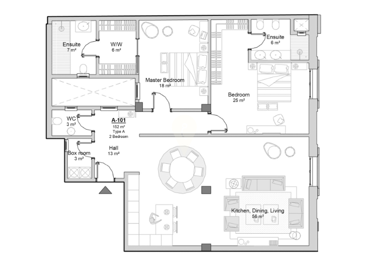 The main entrance of the building has been designed based on a similar alignment and proportion of the old entrance into the building. Its size and proportions give it a sense of subtle grandeur, without being too imposing as compared to palace entrances. The entrance leads to the main core and circulation as well as the grand courtyard. In the grand courtyard at the central core of the project, one finds a lounge area on the ground floor where residents or their guests can meet or relax in a common space. A water feature and greenery lend to the serene atmosphere. In the grand courtyard, one finds the internal walkways linking the various apartments at all levels. The grand courtyard is modeled on the internal yards of palaces and grand buildings found in Valletta which include the open walkways overlooking the ground floor common spaces.