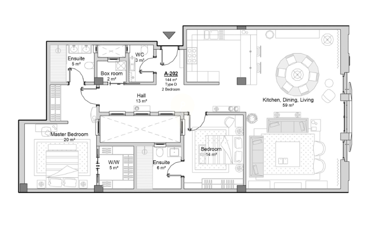The main entrance of the building has been designed based on a similar alignment and proportion of the old entrance into the building. Its size and proportions give it a sense of subtle grandeur, without being too imposing as compared to palace entrances. The entrance leads to the main core and circulation as well as the grand courtyard. In the grand courtyard at the central core of the project, one finds a lounge area on the ground floor where residents or their guests can meet or relax in a common space. A water feature and greenery lend to the serene atmosphere. In the grand courtyard, one finds the internal walkways linking the various apartments at all levels. The grand courtyard is modeled on the internal yards of palaces and grand buildings found in Valletta which include the open walkways overlooking the ground floor common spaces.