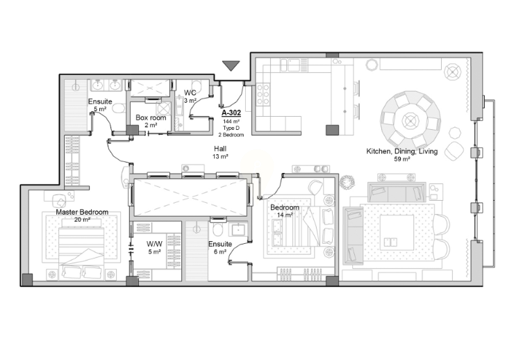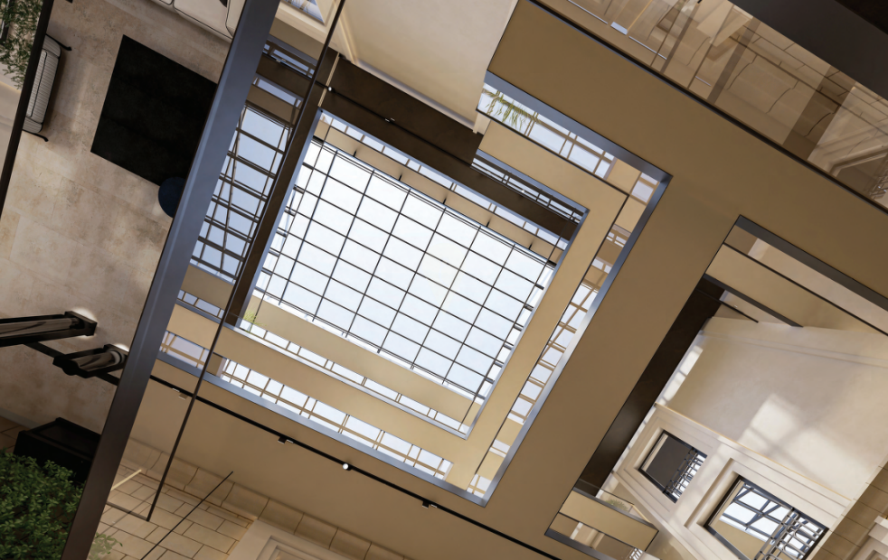 The main entrance of the building has been designed based on a similar alignment and proportion of the old entrance into the building. Its size and proportions give it a sense of subtle grandeur, without being too imposing as compared to palace entrances. The entrance leads to the main core and circulation as well as the grand courtyard. In the grand courtyard at the central core of the project, one finds a lounge area on the ground floor where residents or their guests can meet or relax in a common space. A water feature and greenery lend to the serene atmosphere. In the grand courtyard, one finds the internal walkways linking the various apartments at all levels. The grand courtyard is modeled on the internal yards of palaces and grand buildings found in Valletta which include the open walkways overlooking the ground floor common spaces.