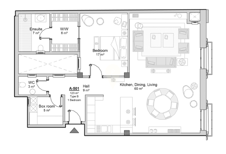 The main entrance of the building has been designed based on a similar alignment and proportion of the old entrance into the building. Its size and proportions give it a sense of subtle grandeur, without being too imposing as compared to palace entrances. The entrance leads to the main core and circulation as well as the grand courtyard. In the grand courtyard at the central core of the project, one finds a lounge area on the ground floor where residents or their guests can meet or relax in a common space. A water feature and greenery lend to the serene atmosphere. In the grand courtyard, one finds the internal walkways linking the various apartments at all levels. The grand courtyard is modeled on the internal yards of palaces and grand buildings found in Valletta which include the open walkways overlooking the ground floor common spaces.