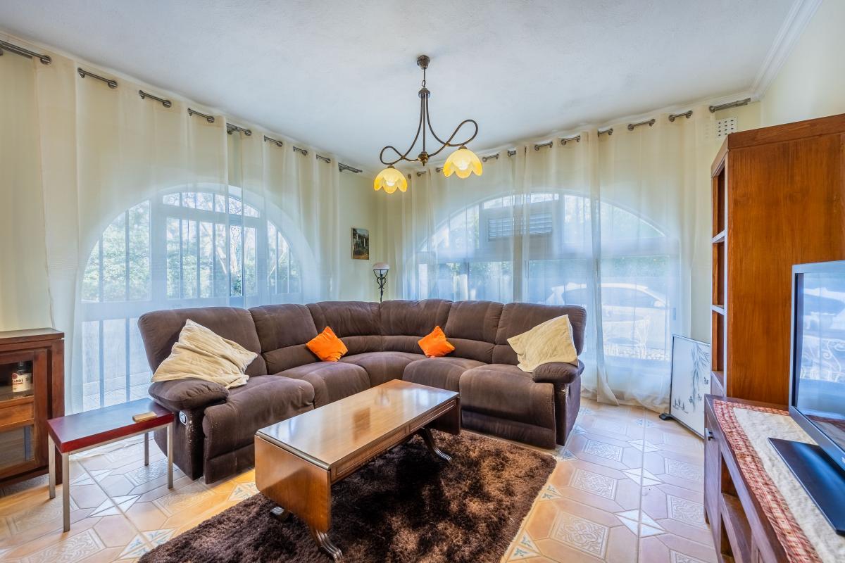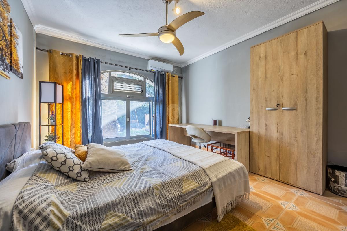 On the lower ground level, there are three double bedrooms, one of which has ensuite facilities, a family bathroom, a full kitchen /dining area, and a large living space. All rooms have large picture windows opening onto a very private open garden space with mature fruit and palm trees. Again, all rooms are air-conditioned.