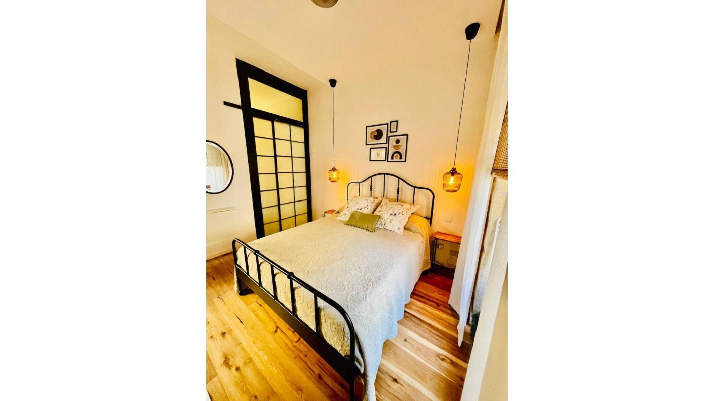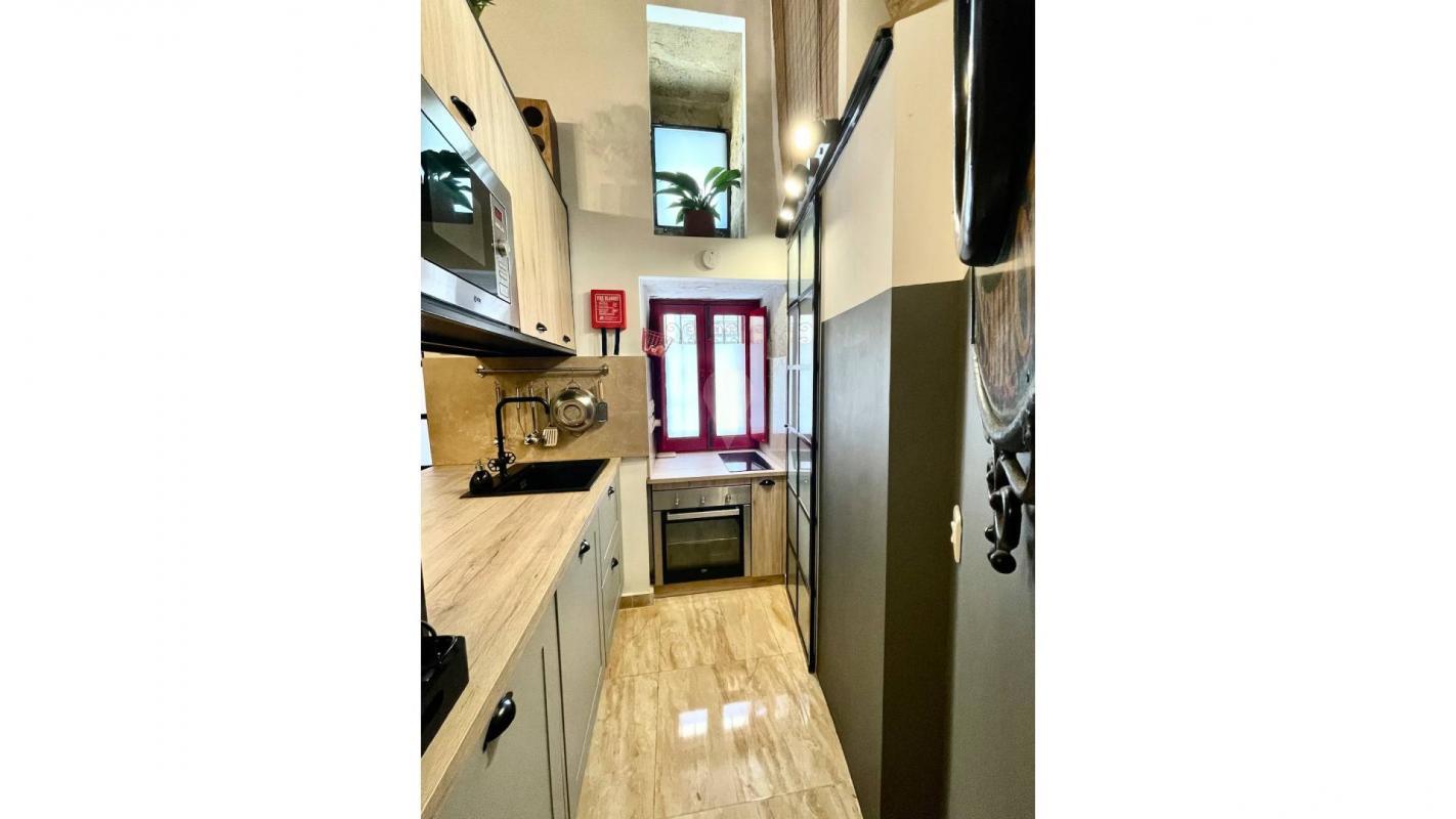 Discover a cozy living area and a fully equipped kitchen through the arched wooden door. The space feels open and inviting with high ceilings and original stone arches.