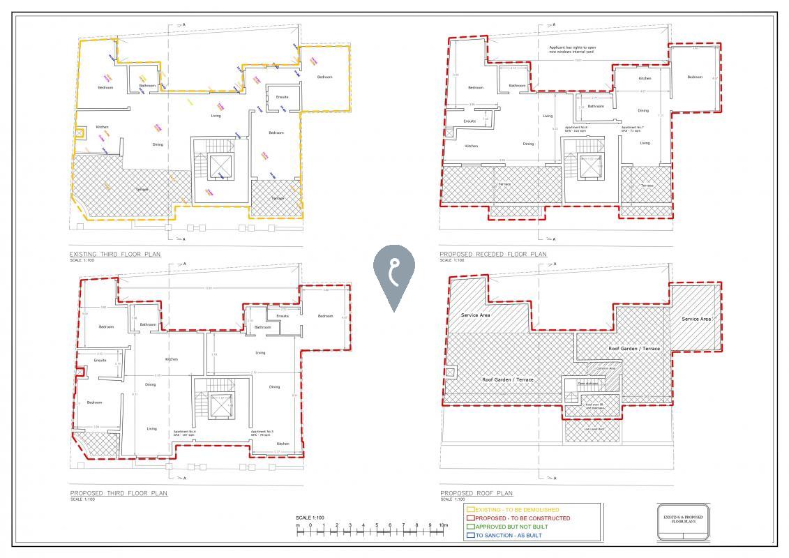 The existing penthouse can be split into two apartments (one bed and another two beds), and one can build another floor with two penthouses (one bed and two beds). The application at the planning authority is currently in process.