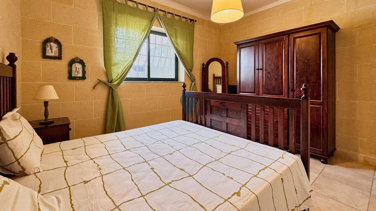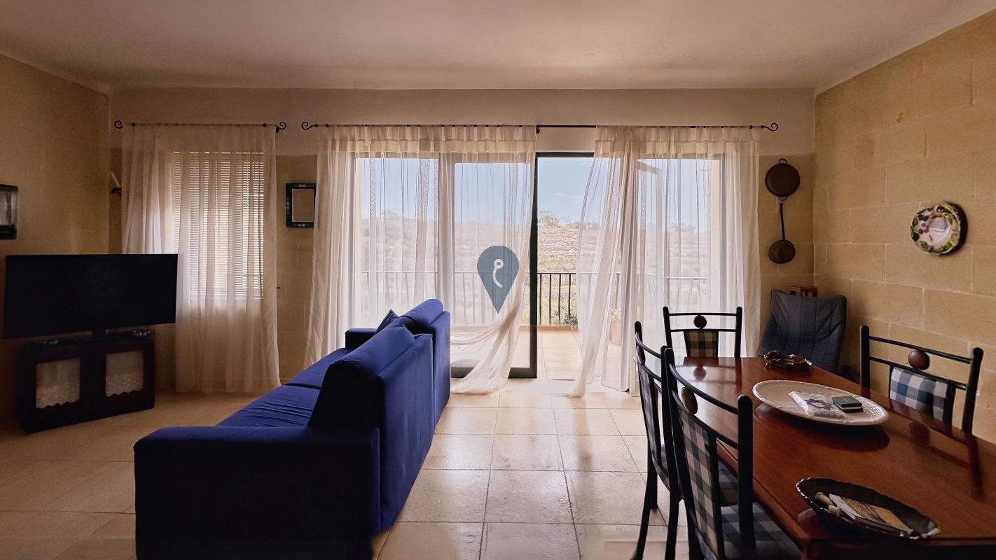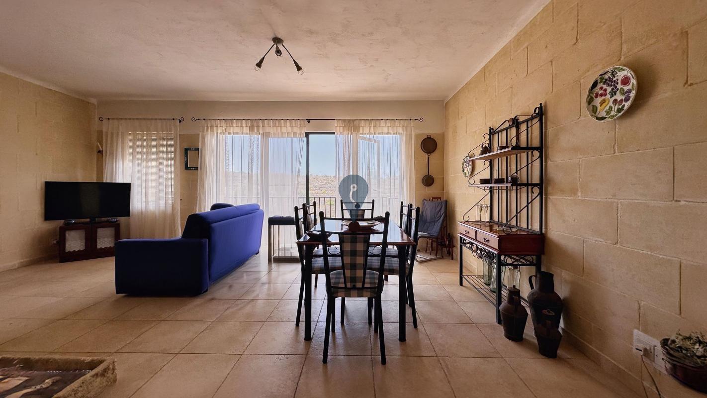QALA, Gozo - Introducing a stunning, fully furnished, and move-in-ready ground-level apartment with two double bedrooms, two bathrooms (one with a shower and another with a tub), an arched kitchen opening to the dining and living area, and a large back terrace with open valley views. Located in a charming limestone block of four units, this 150 sqm property includes a car space. Bright, spacious, and in great condition, it would make a great family home, holiday retreat, or rental investment.