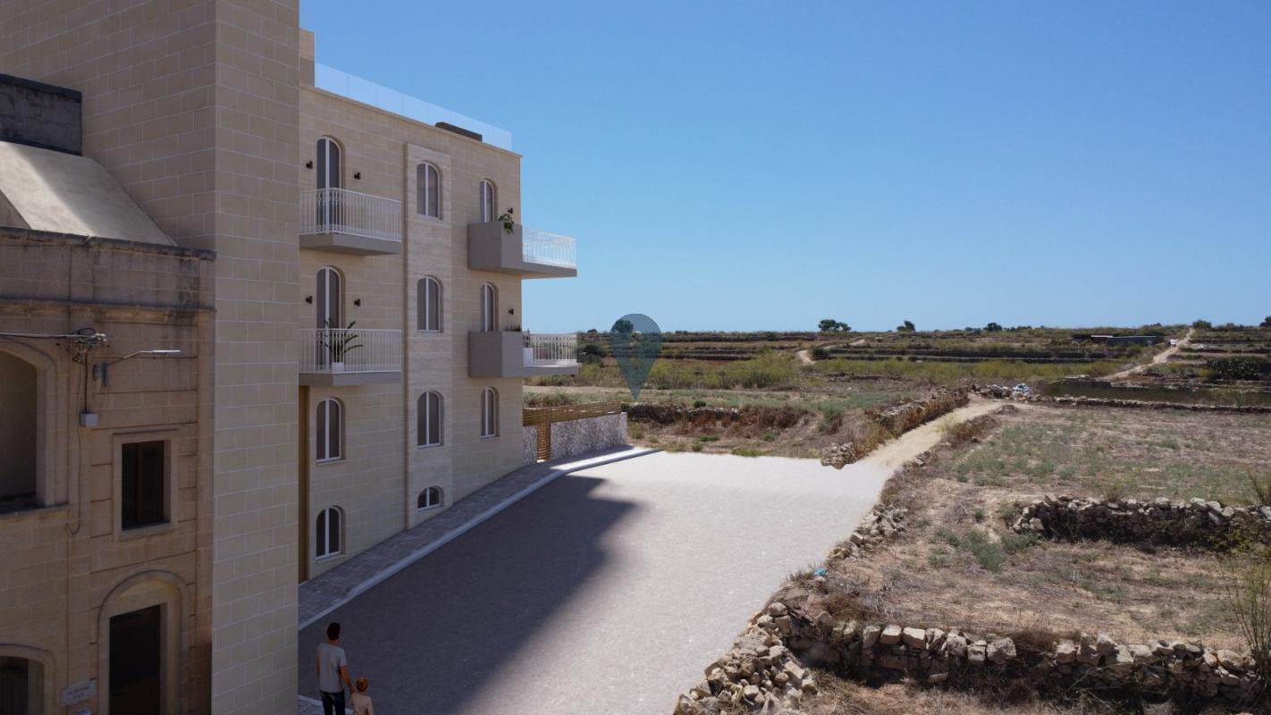 SANNAT, Gozo - New exclusive development at the edge of the development zone enjoying open country views. Second-floor corner unit comprising an open plan kitchen/dining/living area next to a corner terrace enjoying open country views, two bedrooms, two bathrooms and two side balconies. Being offered in shell form with finished common parts and served with lift. Optional garages at basement level. Finishing package on request. Freehold.