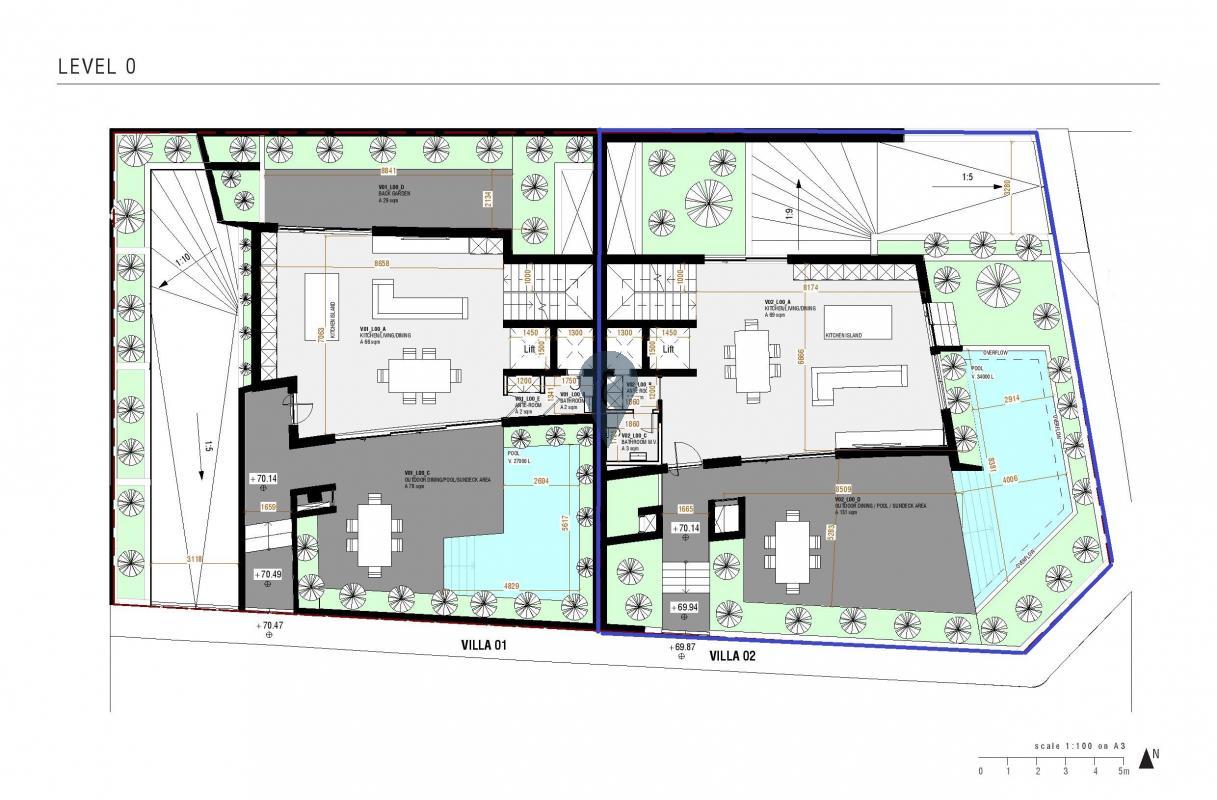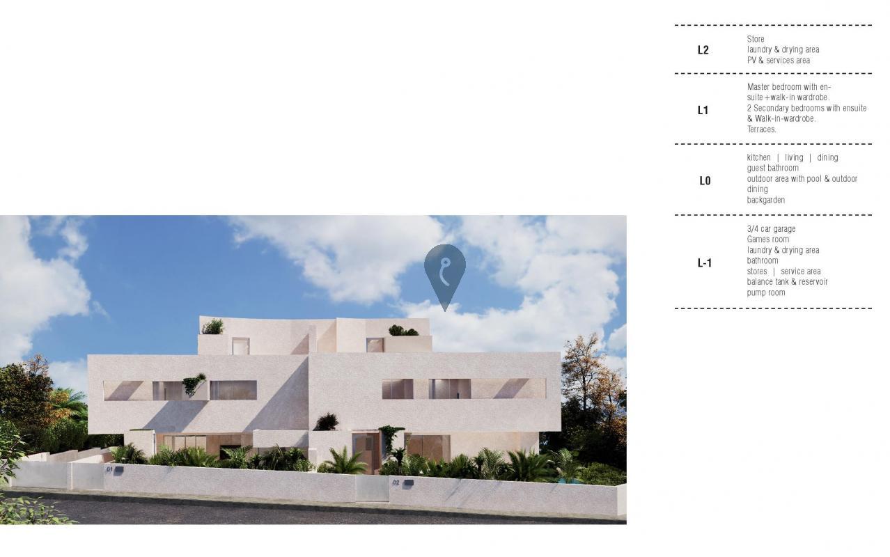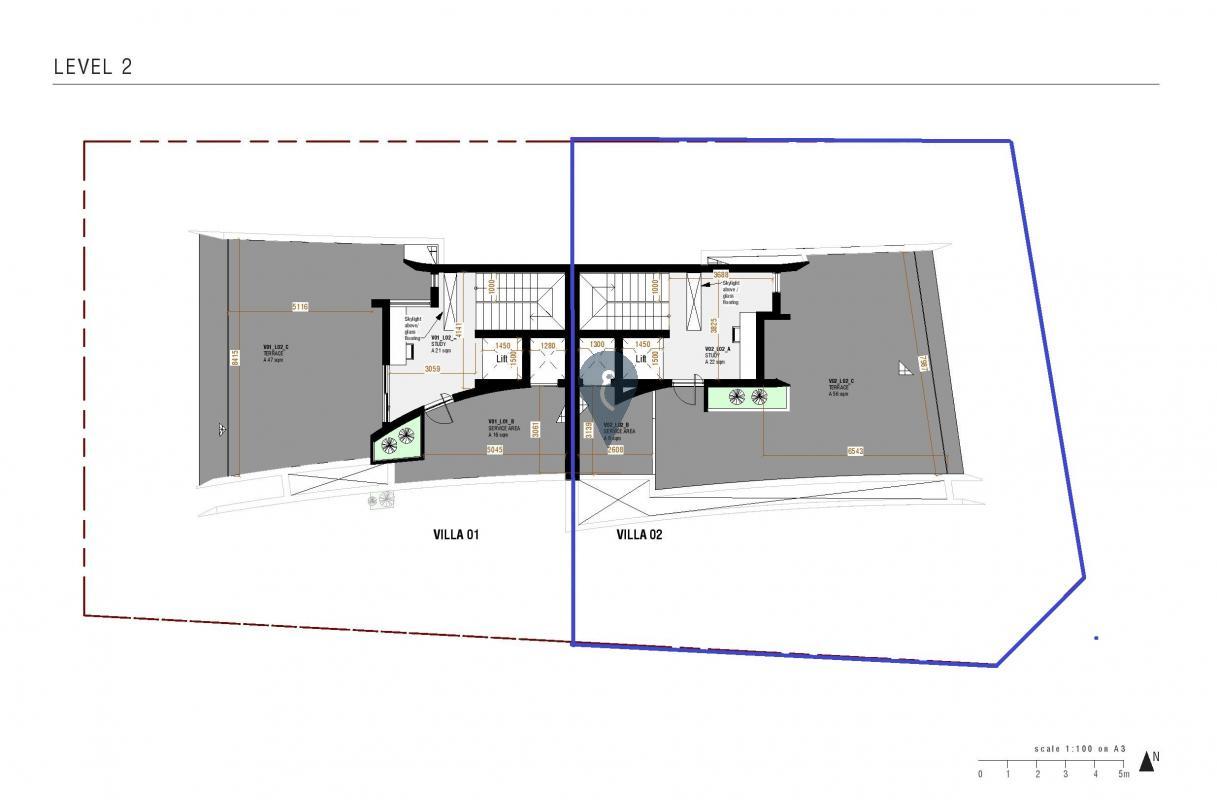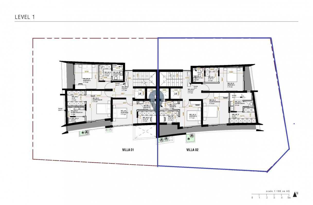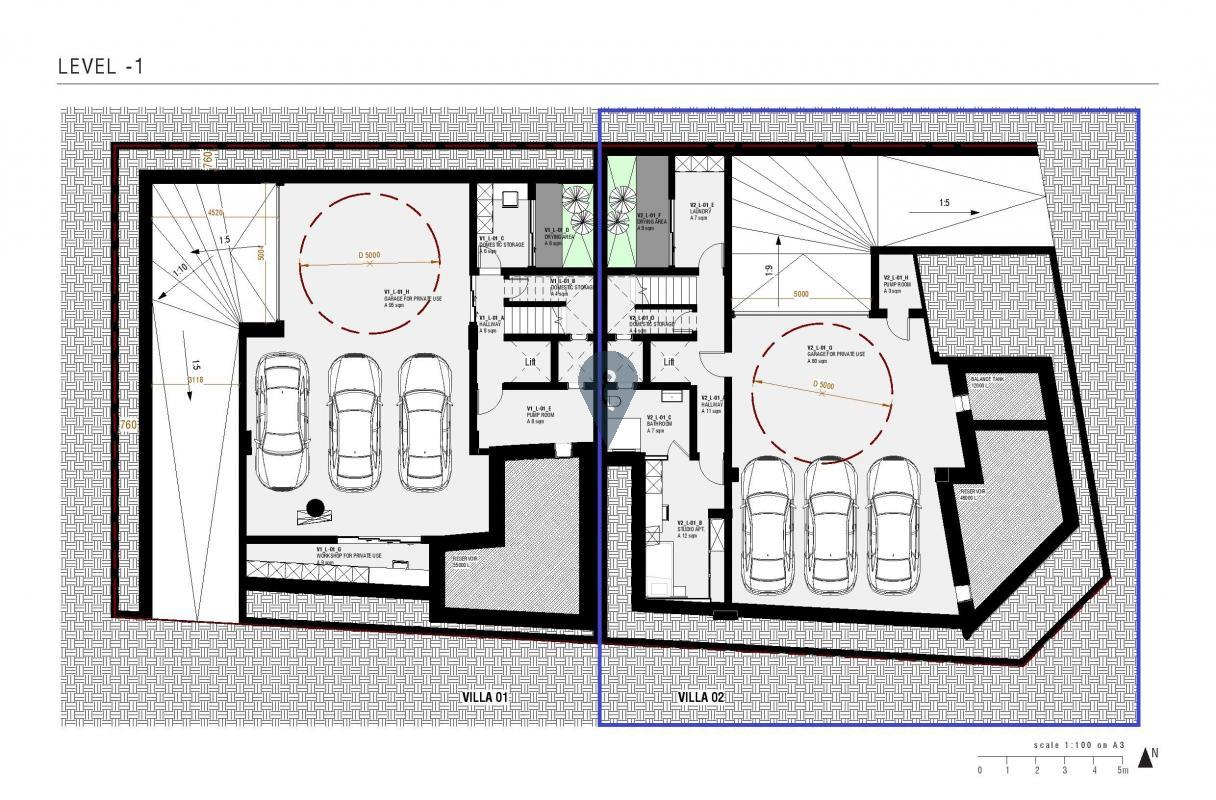 Upper floors feature well-appointed bedrooms, each with ensuite bathrooms, walk-in wardrobes, and master suites. Additional highlights include terraces, study rooms, and service areas, catering to modern, luxurious living. Both villas have private garages, laundry rooms, storage, and a pump room.