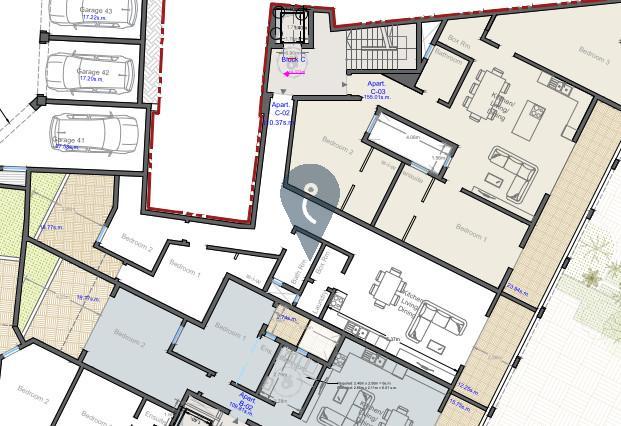 First-floor apartment comprising an open plan kitchen/dining/living room, two bedrooms, two bathrooms, box room, a front terrace and a back yard. Being offered in semi-finished state (including external apertures, front door, tiling of yard and water tank and other finishings) with finished common parts, lift, swimming pool and gardens included in the price. Freehold. Optional garages at ground and basement levels. Finishing packages on request.