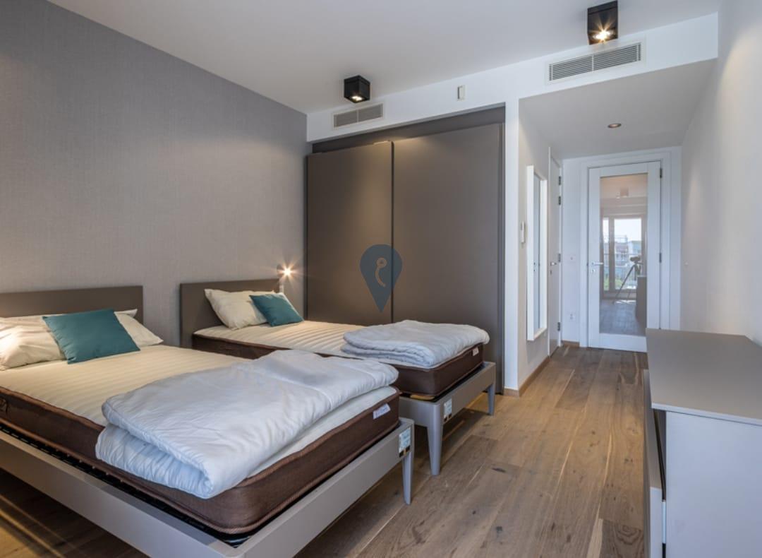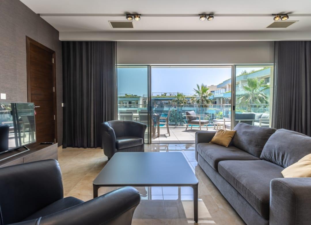 Perched on the second floor, the apartment features a bright and airy open-plan living and dining area with an 18 sqm terrace—ideal for entertaining or enjoying picturesque lagoon views. The modern, fully equipped kitchen is seamlessly integrated into the layout, while the sleeping quarters offer two double bedrooms with en-suite facilities.