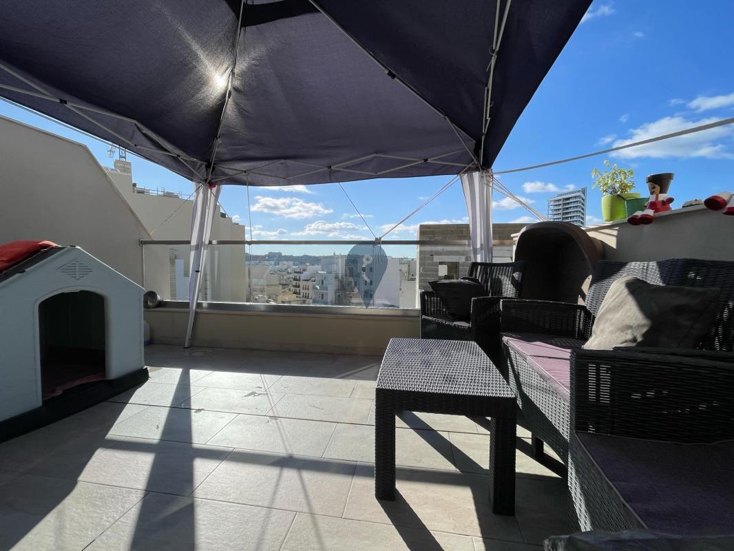 GZIRA - modern fully furnished two-bedroom penthouse in the heart of Gzira. The property comprises a compact open-plan kitchen, living, and dining room leading to a spacious terrace, main bathroom, master bedroom with walk-in wardrobe and en-suite, and a spare bedroom. Complementing this penthouse full ownership of the roof structurally made to install the pool. The excess to the roof is through the door at the common staircase.