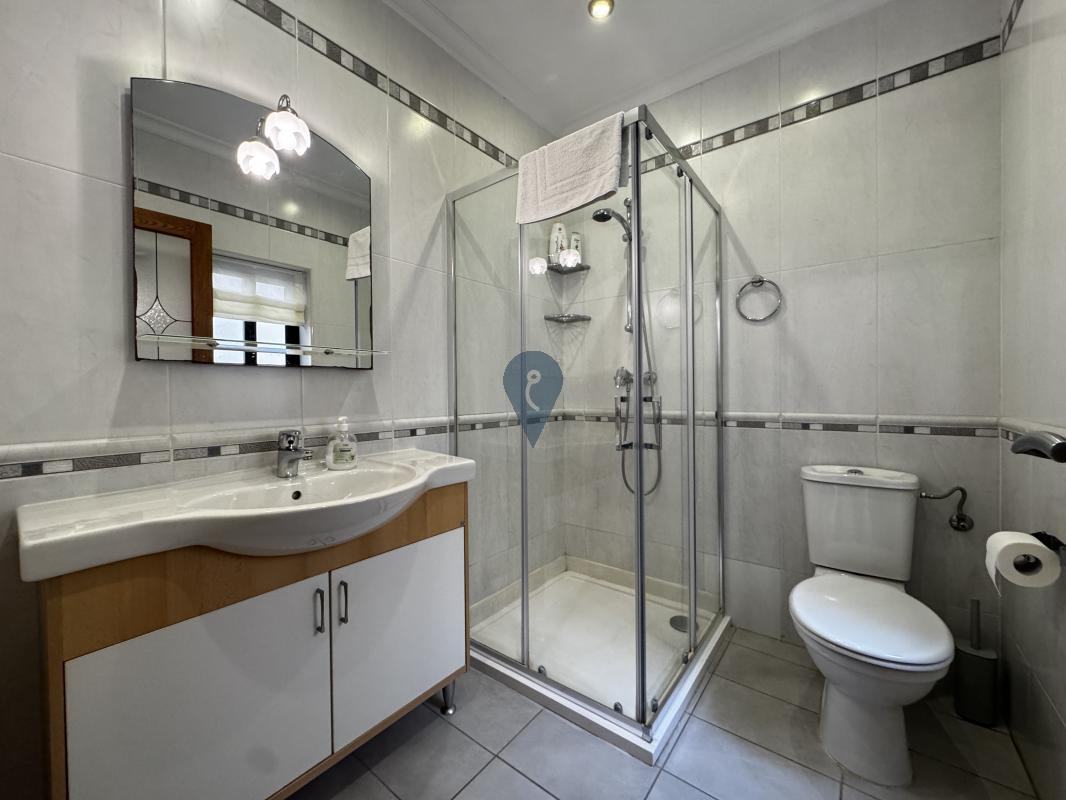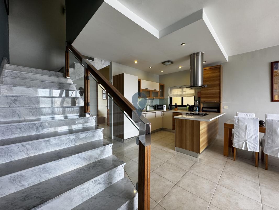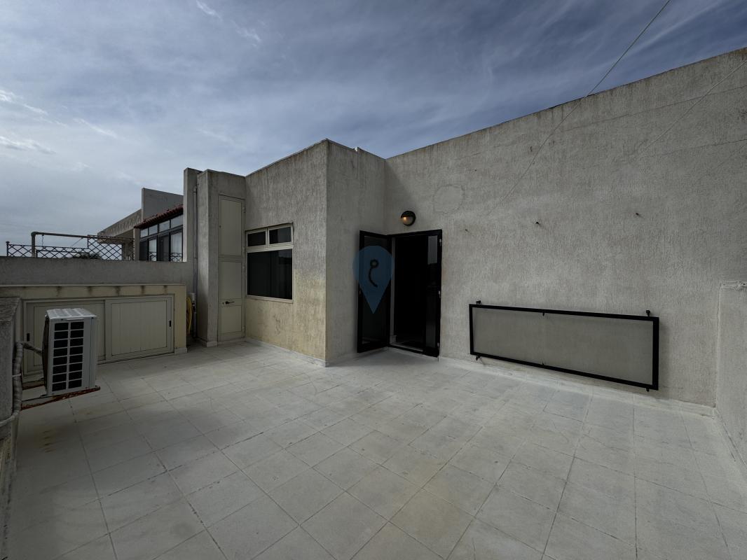Inside, the modern open-plan layout features a fully equipped kitchen and a spacious living area that seamlessly connects to the main terrace. The penthouse comprises three bedrooms: the main bedroom, located upstairs, includes a large en-suite bathroom and a private terrace. The second bedroom is equipped with a ceiling fan, as is the living room, ensuring comfort year-round.