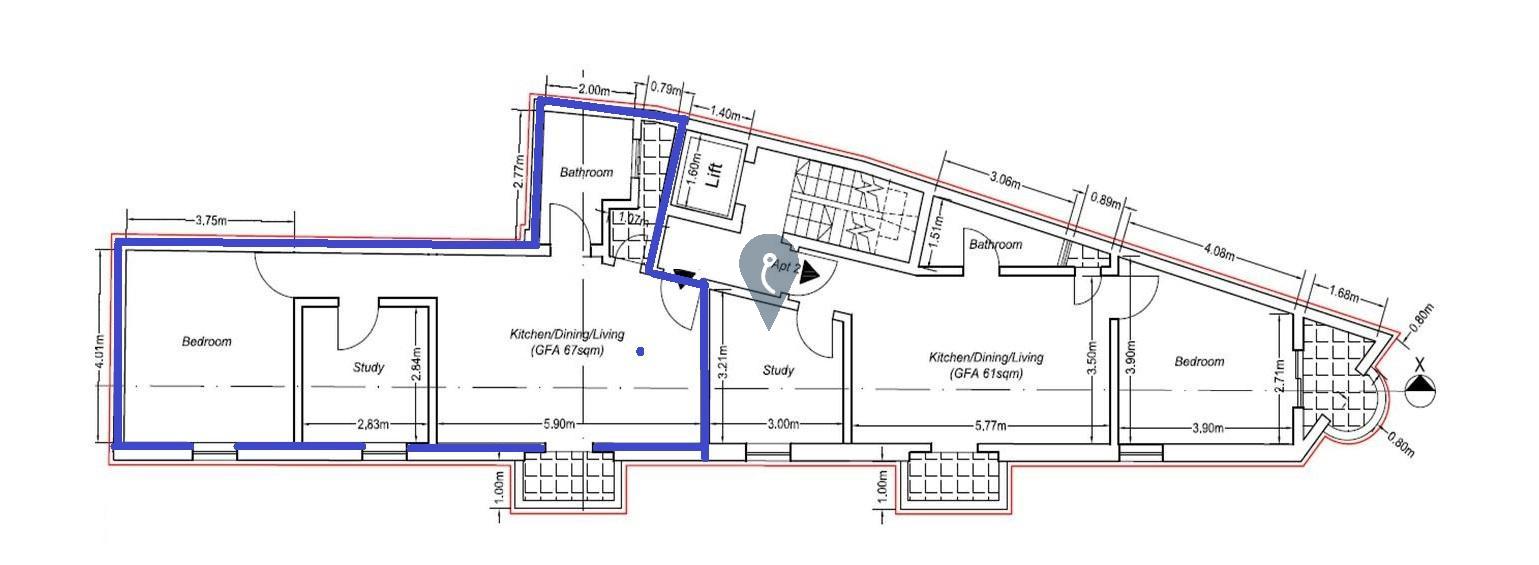 The apartment features a spacious open-plan kitchen, living, and dining area, designed for both functionality and comfort. A separate study provides a versatile space for a home office or additional storage area. The bedroom is well-sized, ensuring a cozy retreat, while a lift provides easy access to all floors.