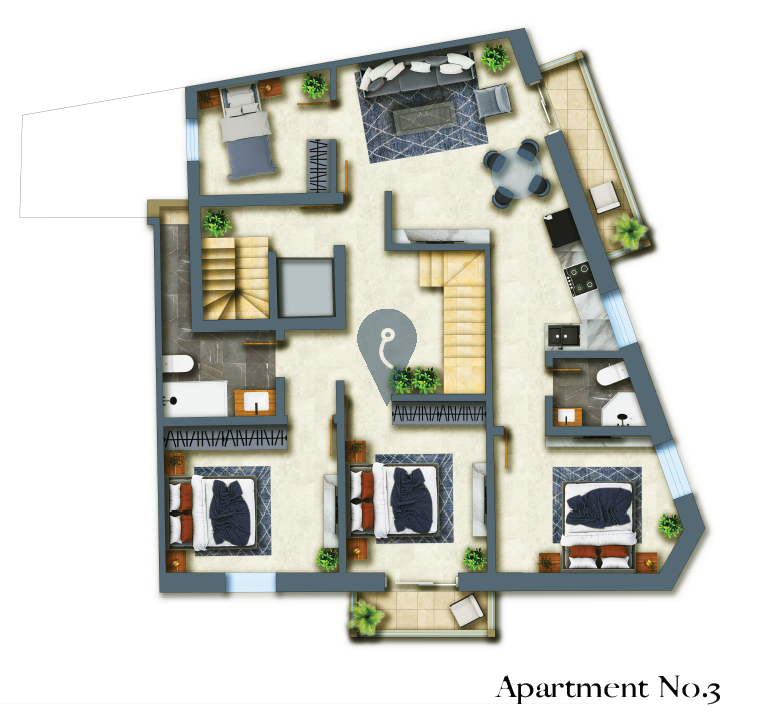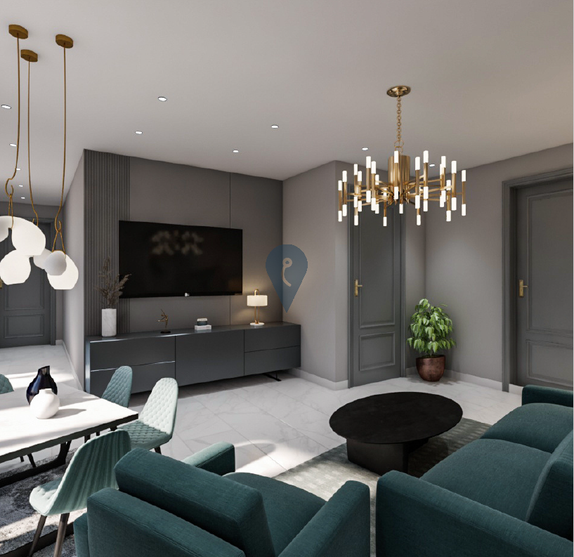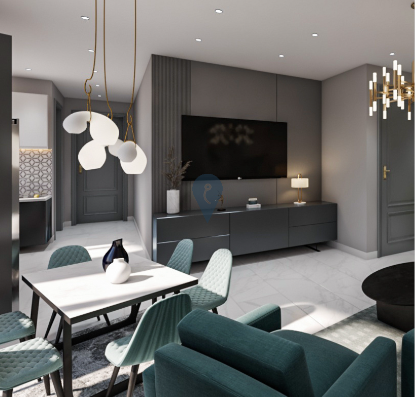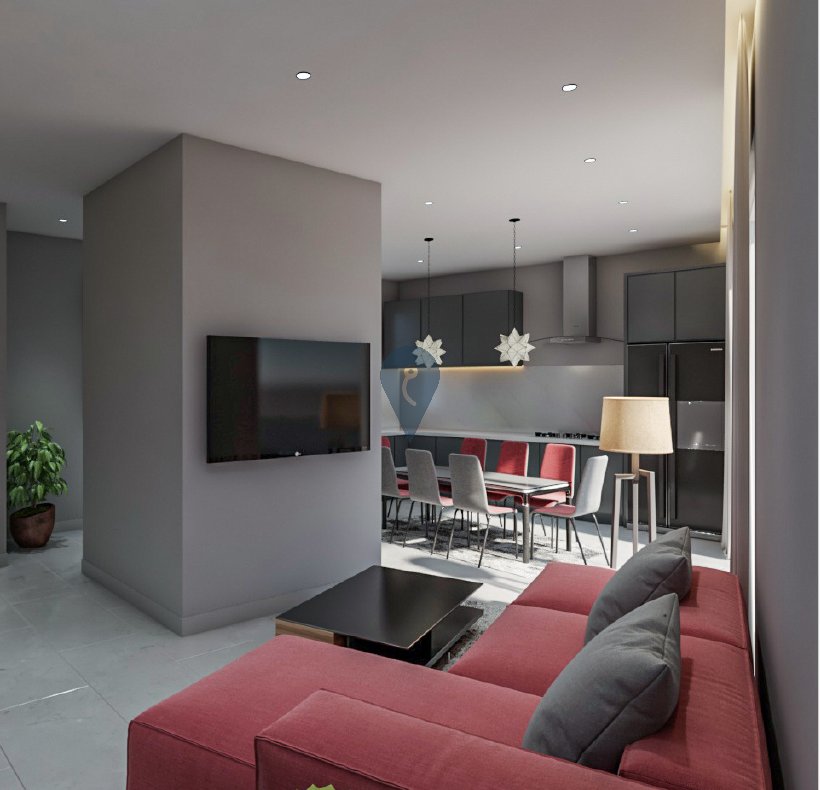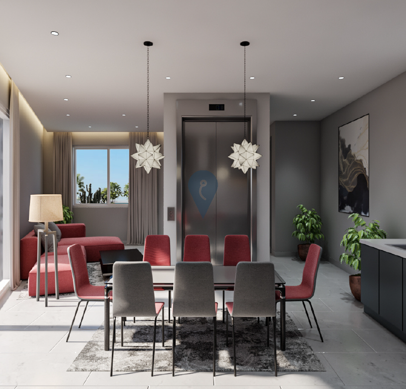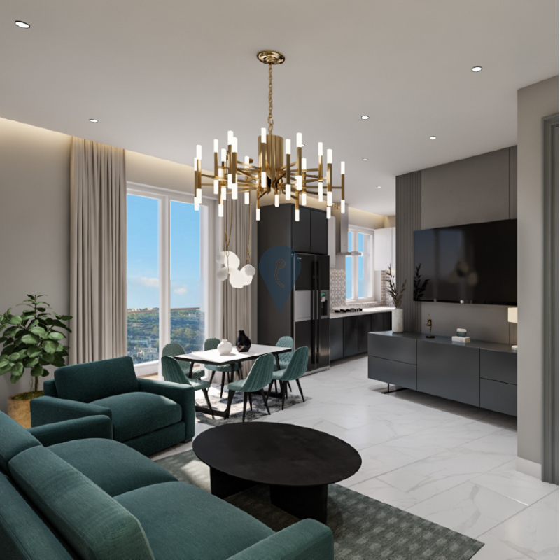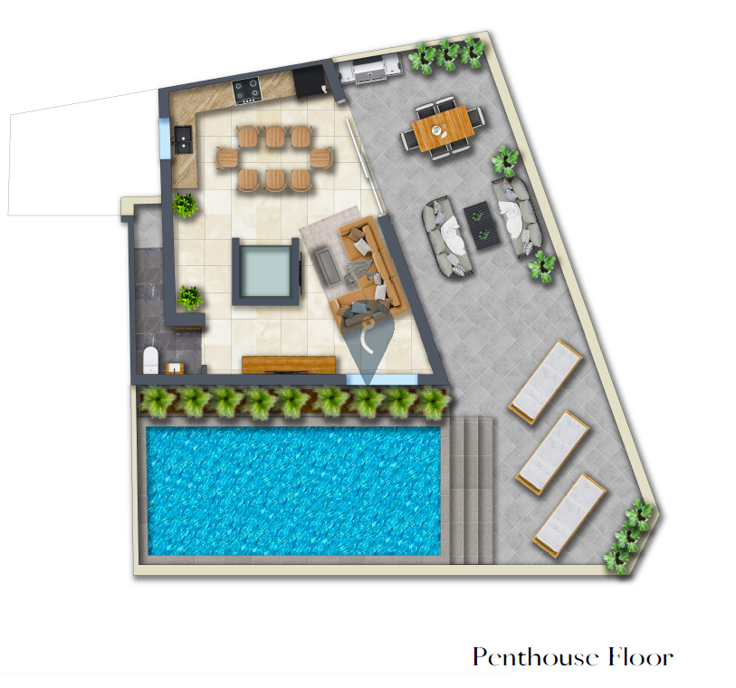 The penthouse features a spacious open-plan living and dining area with a squarish layout that eliminates corridors, maximizing usable space. It includes two well-sized bedrooms and two bathrooms, providing convenience and privacy. The layout is designed to offer both functionality and style.