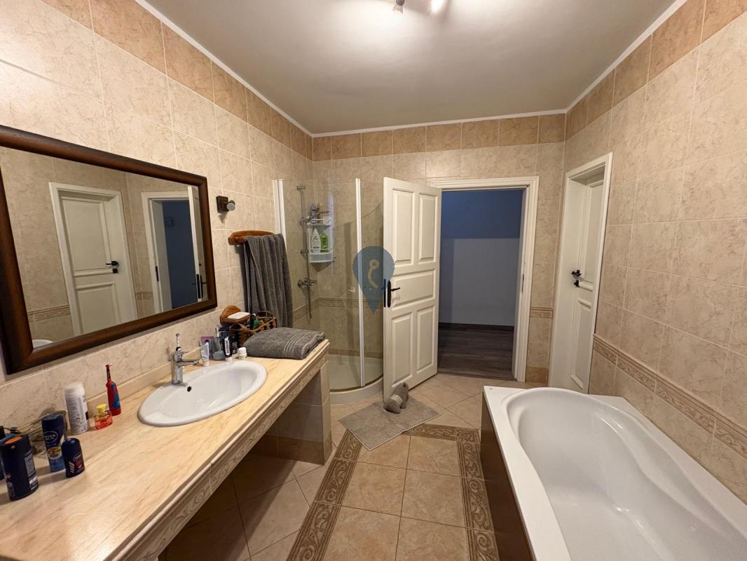 Boasting approximately one hundred and eighty-four sqm of internal space, the home is filled with natural light thanks to its semi-detached layout and windows on all sides. It features a generous open-plan kitchen, living, and dining area, complemented by an additional living room that opens onto a large side terrace—perfect for entertaining or enjoying sunny days. The expansive terrace runs along the side of the property, enhancing the home's bright and airy atmosphere.