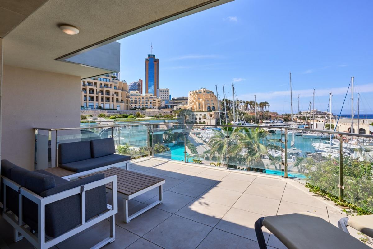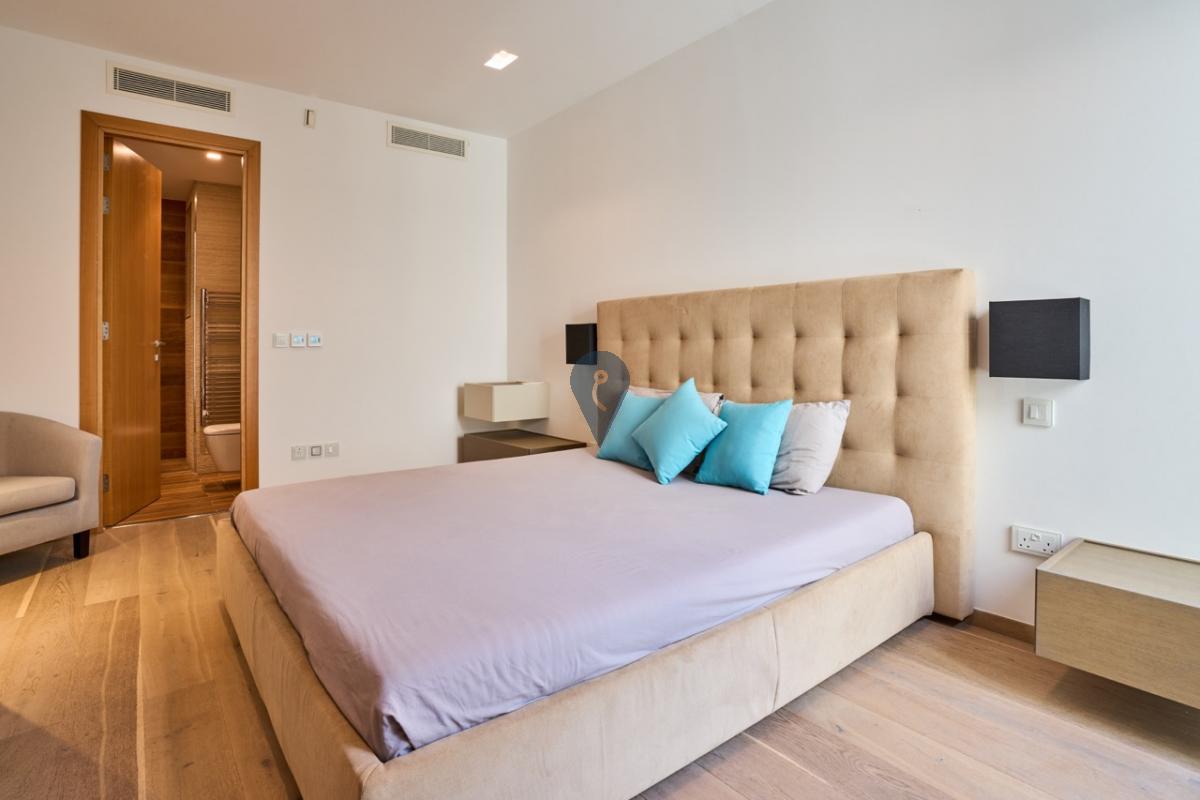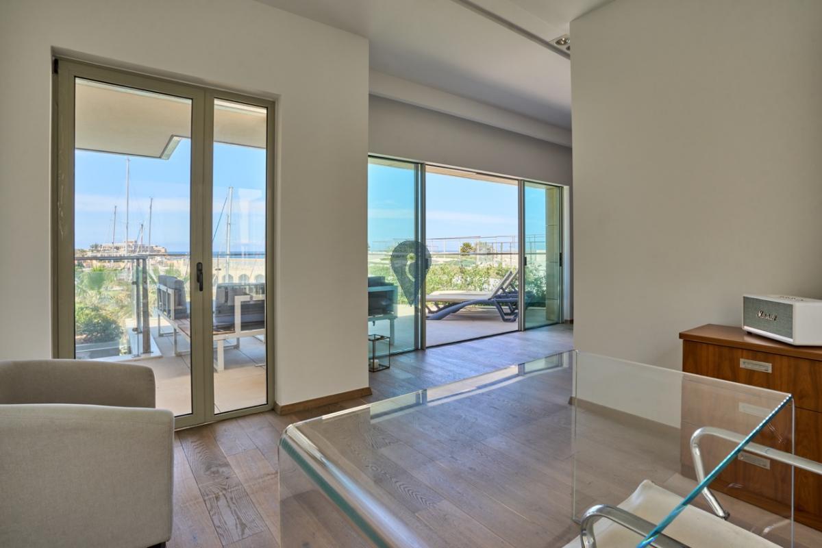 The living area extends seamlessly to a generous terrace, where breathtaking views of the Portomaso Marina create a perfect backdrop for alfresco dining or evening relaxation. Underfloor heating throughout the apartment ensures year-round comfort.
