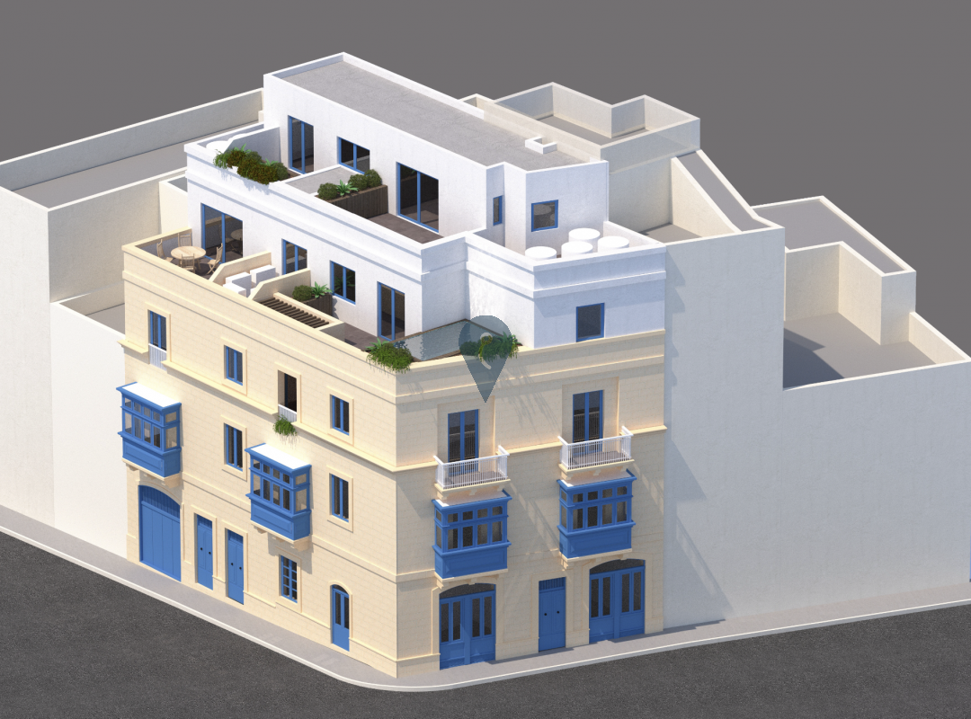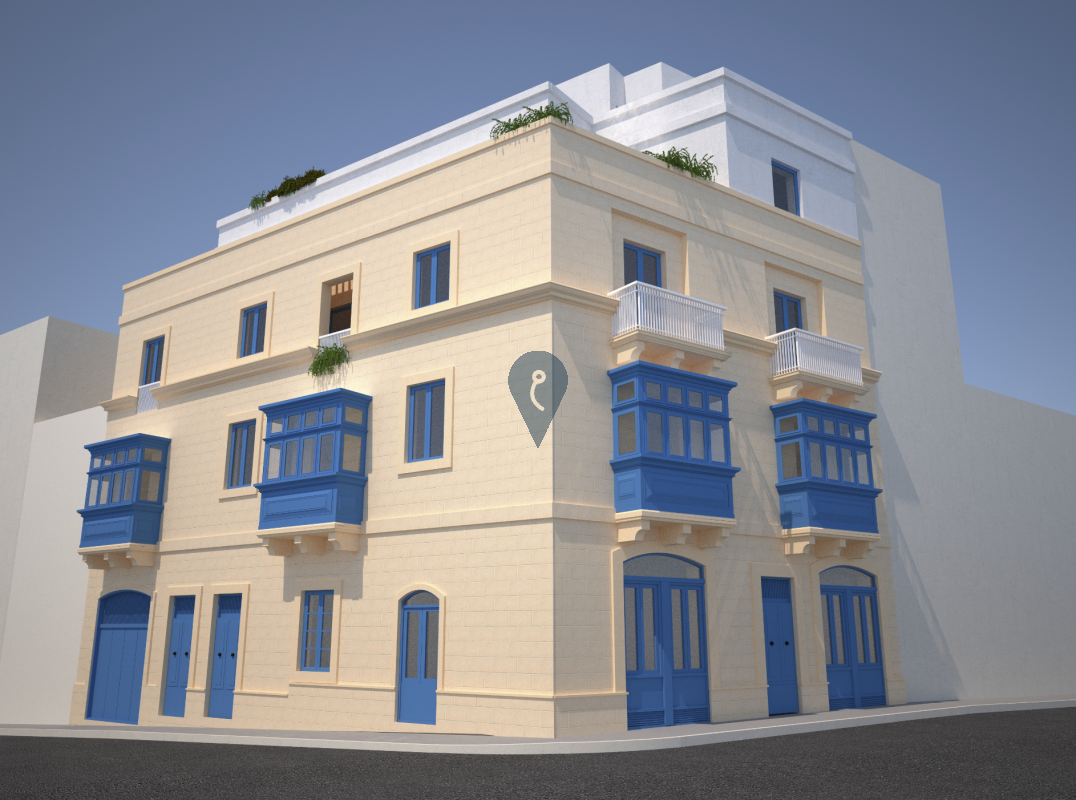 The façade showcases classic Maltese limestone with elegant blue accents, blending traditional charm with modern design.