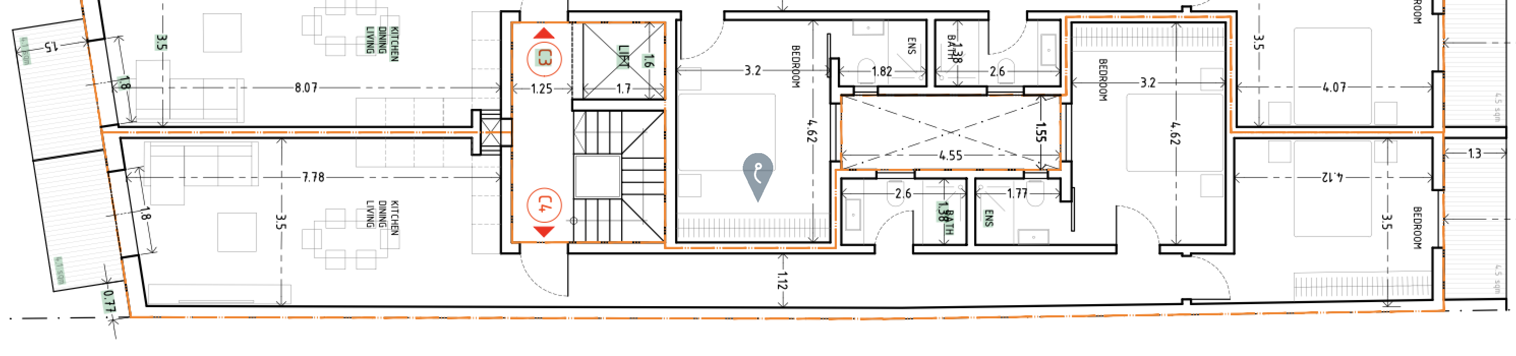 It comprises two double bedrooms, including a master with an ensuite, a main guest bathroom, and a rear balcony, ensuring plenty of natural light and ventilation throughout.