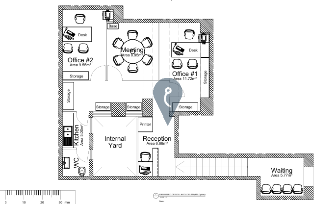 Spanning approximately 50sqm, this versatile office features a practical, well-designed layout that allows for both private workspaces and open-plan arrangements.