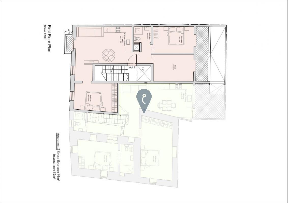 The well-designed apartment features a thoughtfully planned open-plan layout that seamlessly integrates the kitchen, dining, and living areas, creating an ideal space for both relaxation and entertaining. The property includes two comfortable bedrooms, each offering ample space and natural light, making it perfect for families, couples with guests, or those requiring additional sleeping arrangements. Additionally, a versatile study provides the ideal space for a home office, creative workspace, or can easily be converted into a third bedroom when needed. One well-appointed bathroom ensures convenience and comfort for residents and guests.
