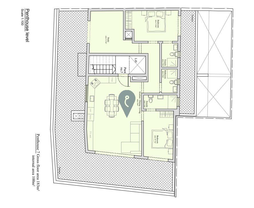 The spacious corner penthouse features a thoughtfully designed open-plan layout that seamlessly integrates the kitchen, dining, and living areas, creating an ideal space for both relaxation and entertaining. The property includes two comfortable bedrooms and a versatile study that can be adapted to your specific needs, whether as a home office or additional sleeping space. Three well-appointed bathrooms ensure convenience and comfort for residents and guests alike.