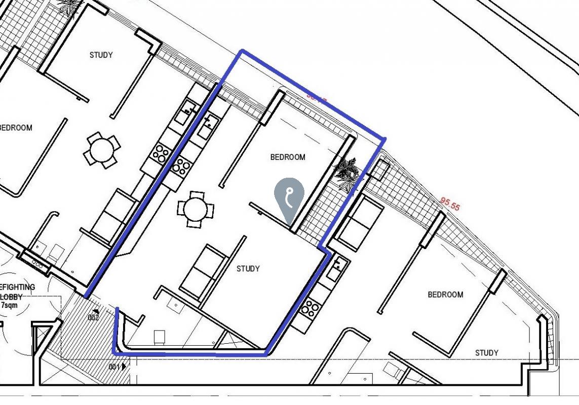 The layout features a bright, open-plan kitchen, living and dining area, a main bathroom, a spacious bedroom, and an additional study, making it versatile enough to be used as a one-bedroom apartment with a dedicated work-from-home space.