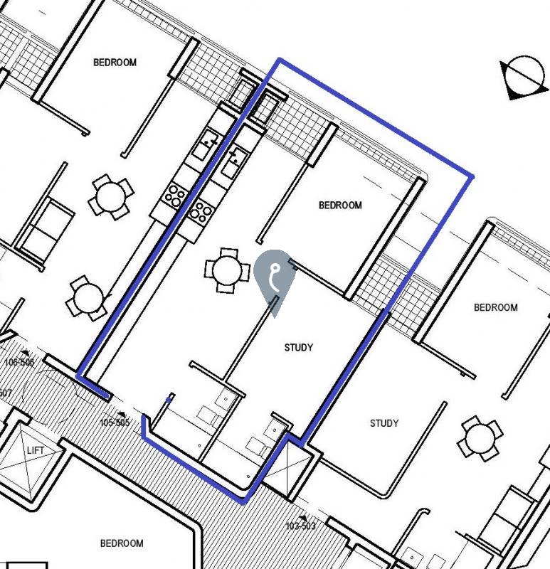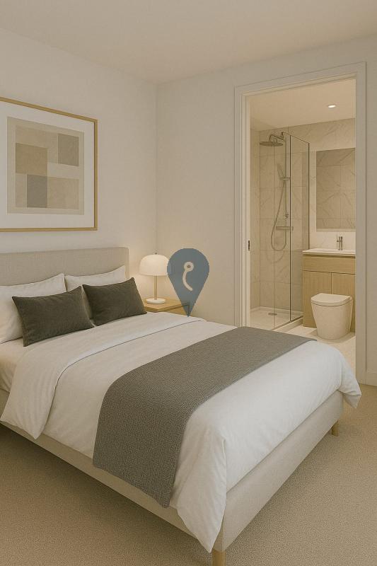The layout comprises a bright open-plan kitchen, living and dining area, a spacious bedroom with its own en-suite bathroom, a separate main bathroom, and an additional study – making it versatile enough to be used as a one-bedroom home with a dedicated workspace.